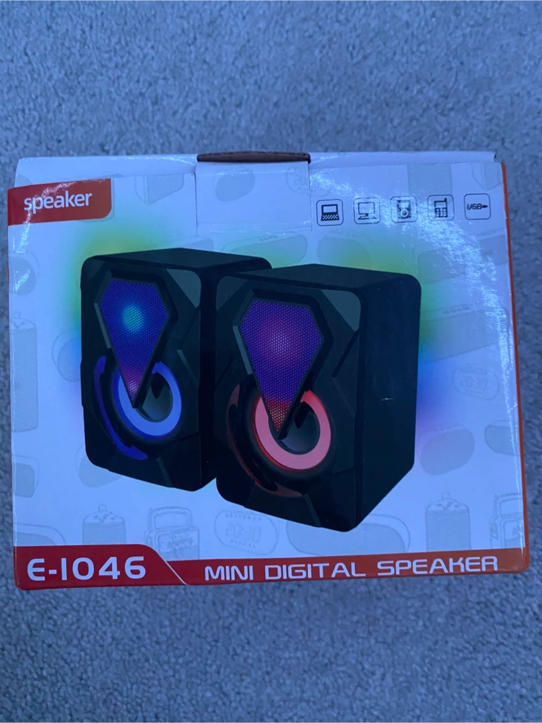 Selling a brand new E-1046 Mini Digital Speaker, still in its original packaging! This 2.0 multimedia speaker features high-quality active speakers with light, perfect for mobile phones, computers, or any 3.5mm port devices. Get great sound in a compact package!