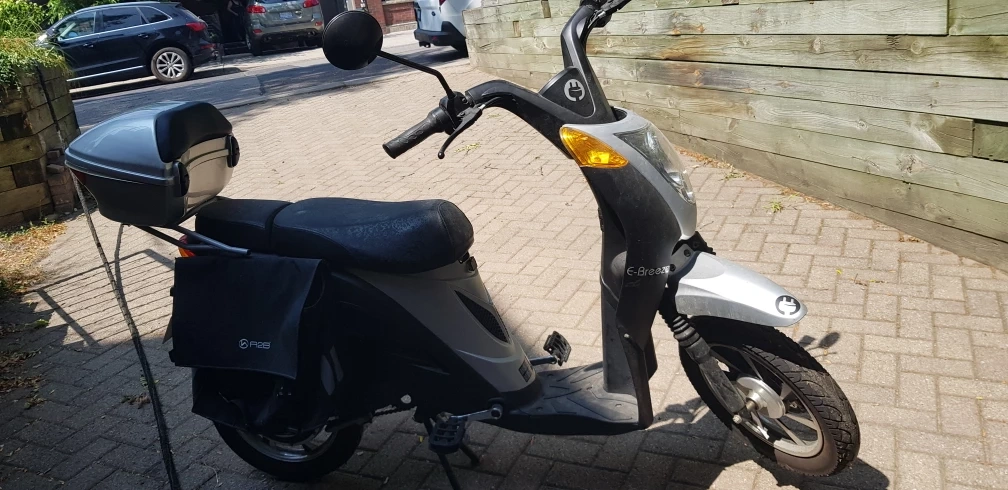 Selling an Amego E-Breeze electric scooter. It has a silver and black colour scheme and comes with a storage box and side bags. SELLING WITHOUT BATTERY AND PRICED ACCORDINGLY. Open to reasonable offers.