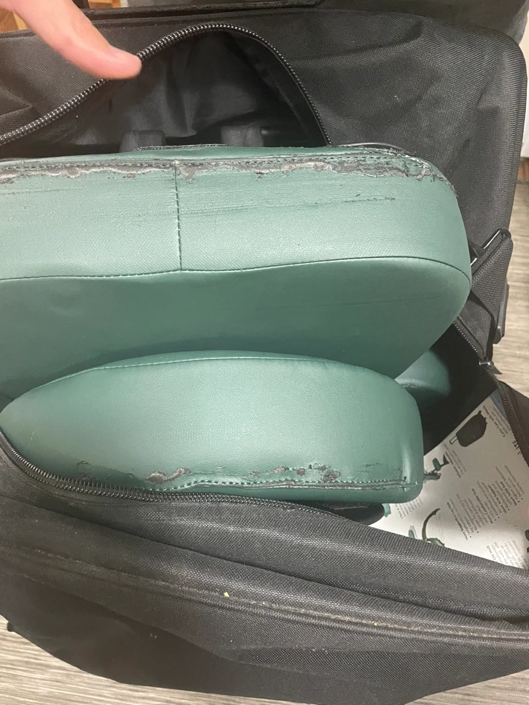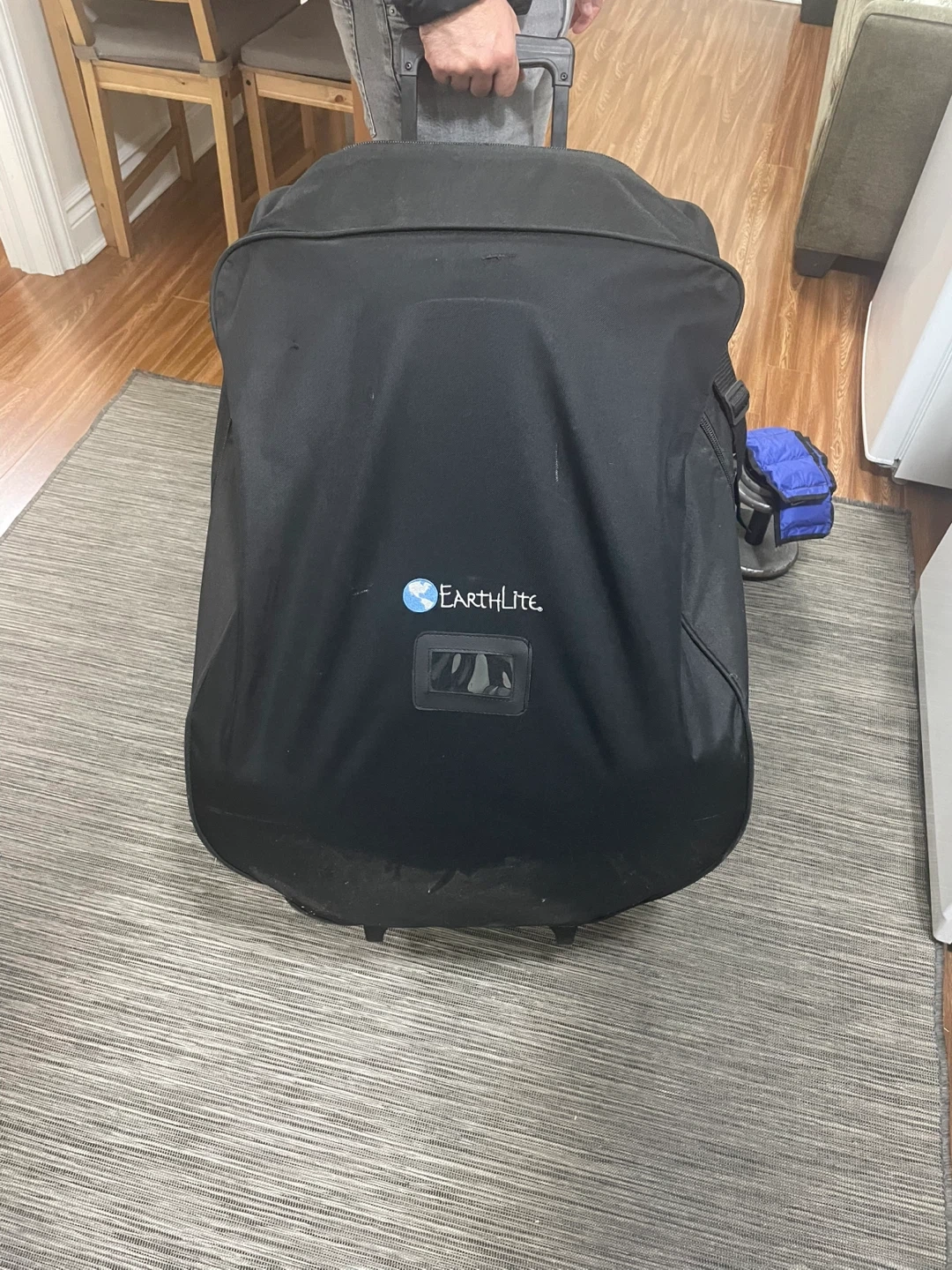 Earthlite massage table carry case in black. It has some wear and tear on the inside.