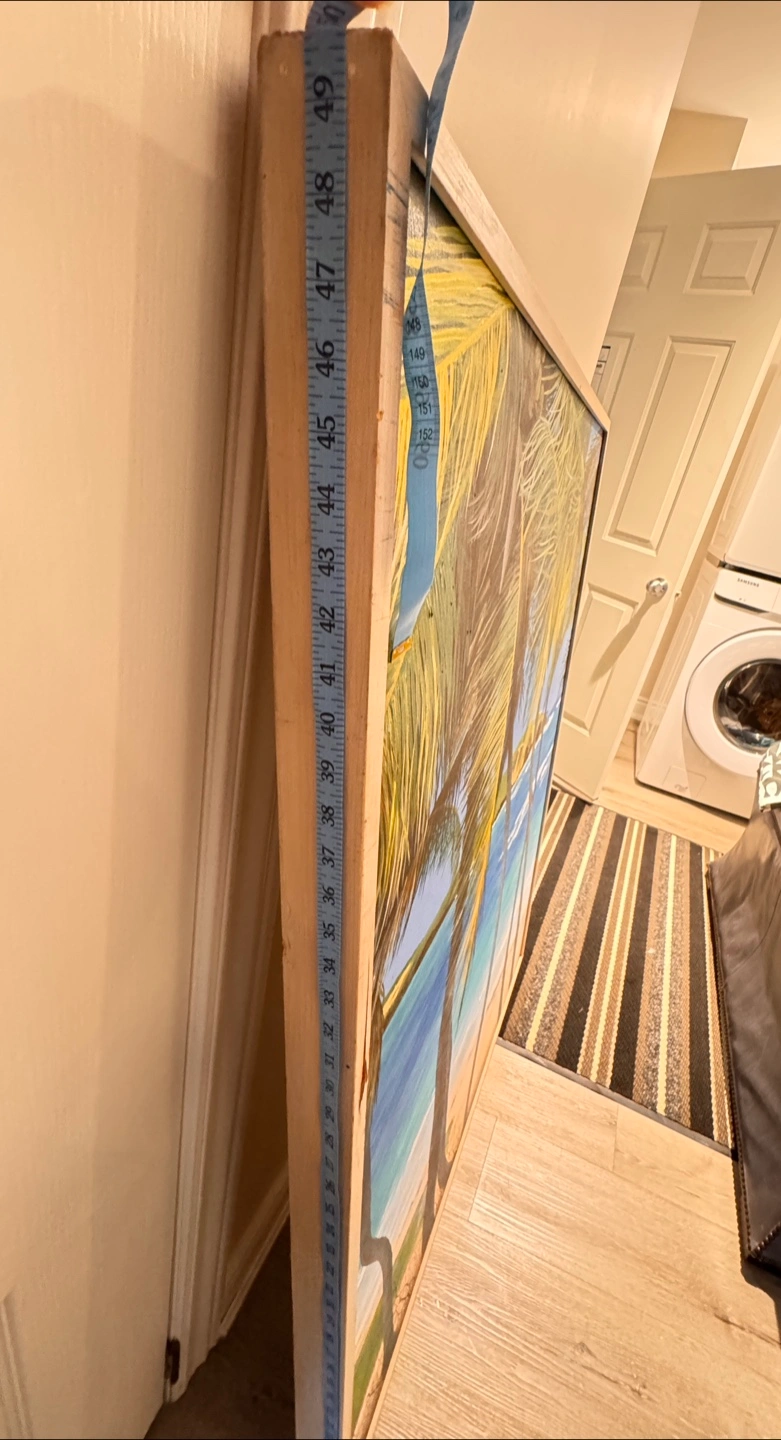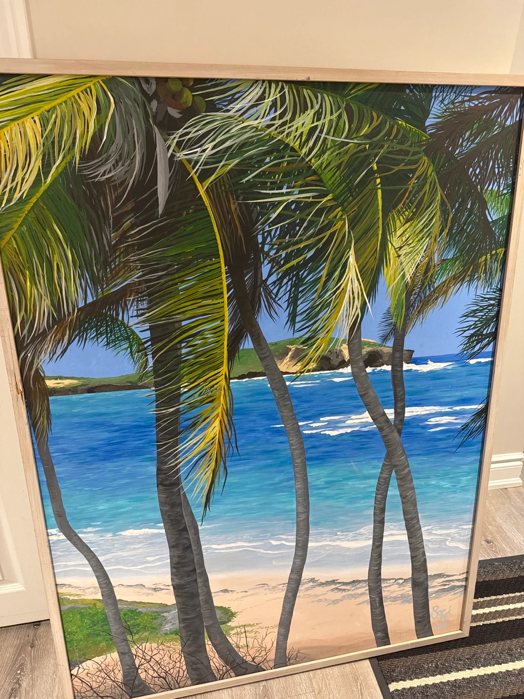 Bought this in East Coast, Costa Rica for $650. Selling it because my new house doesn’t have much space to put it. (Cas Cafe painting). The painting depicts a beach scene with palm trees. The back of the painting is signed ‘Sofi 05/04’. It measures approximately 37 inches in width and 49 inches in length.