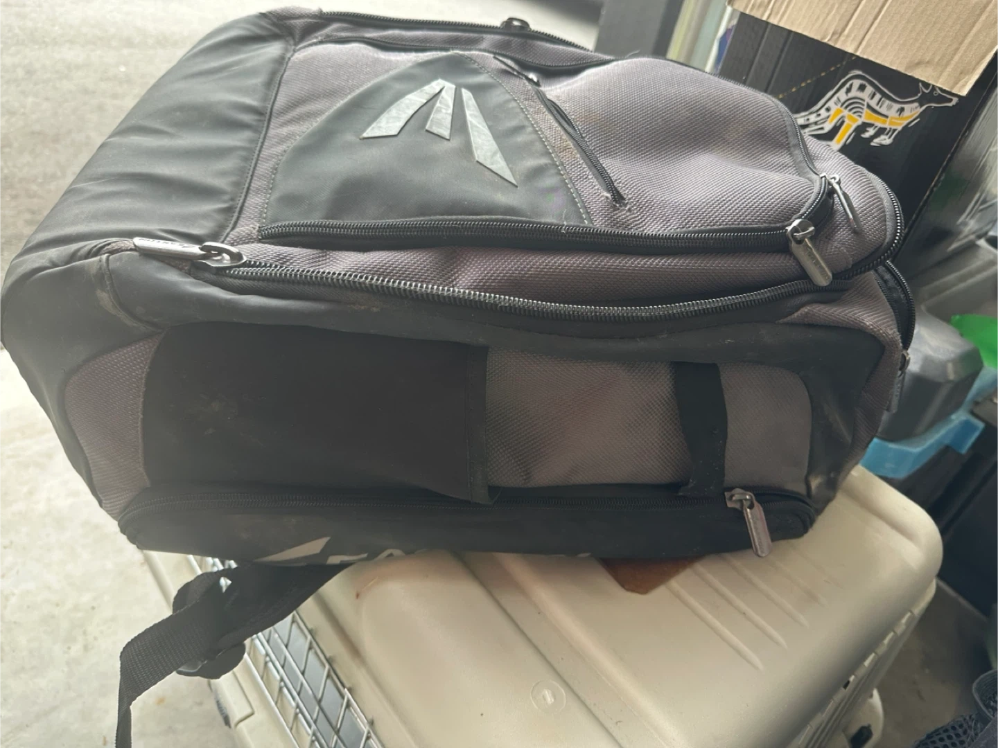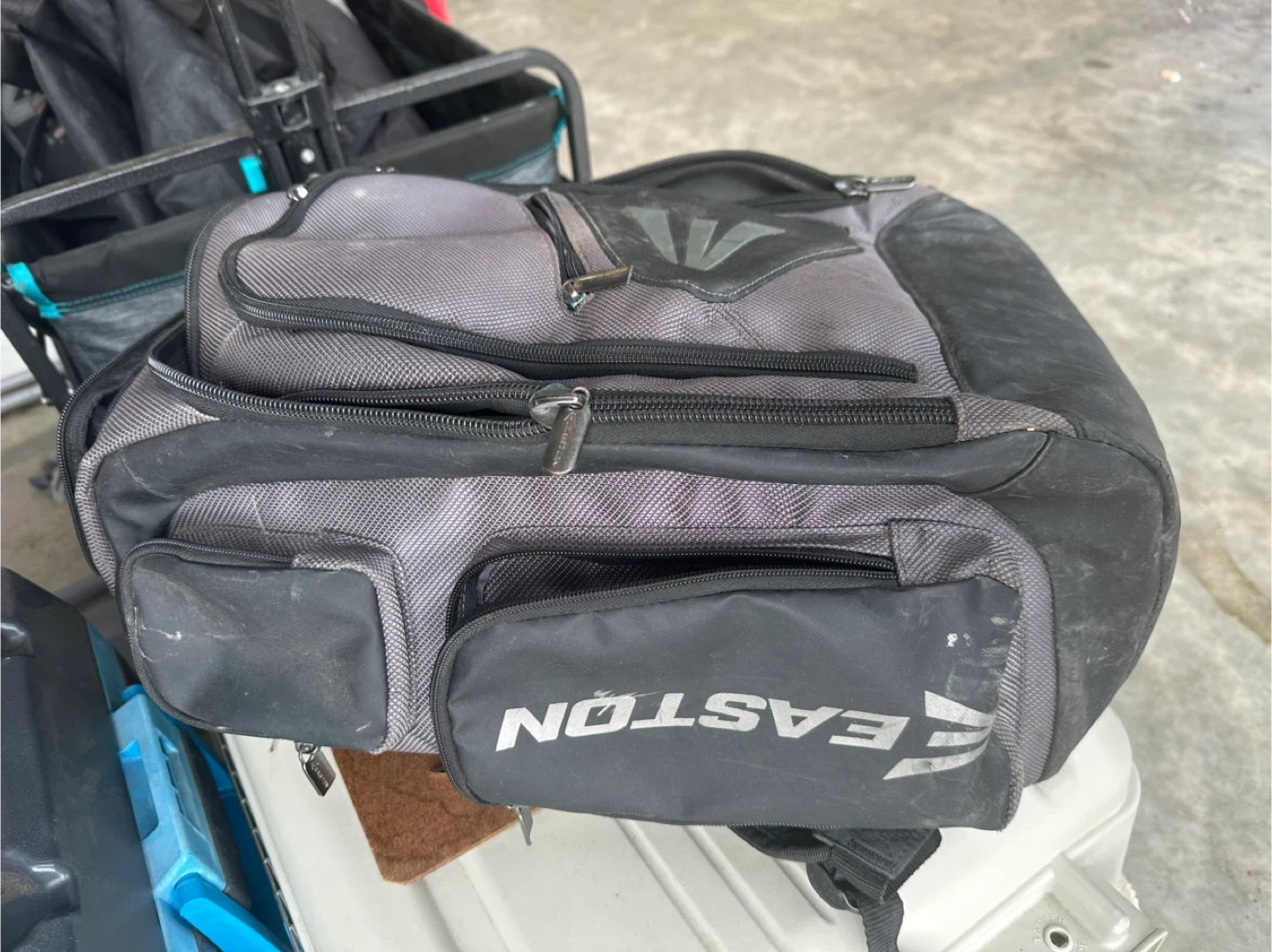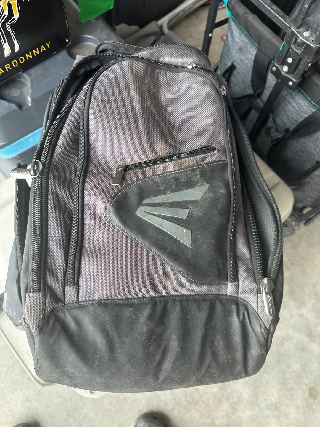Selling an Easton backpack in grey and black. It's a bit dusty but still in good condition and ready for a new home! Perfect for carrying your gear.