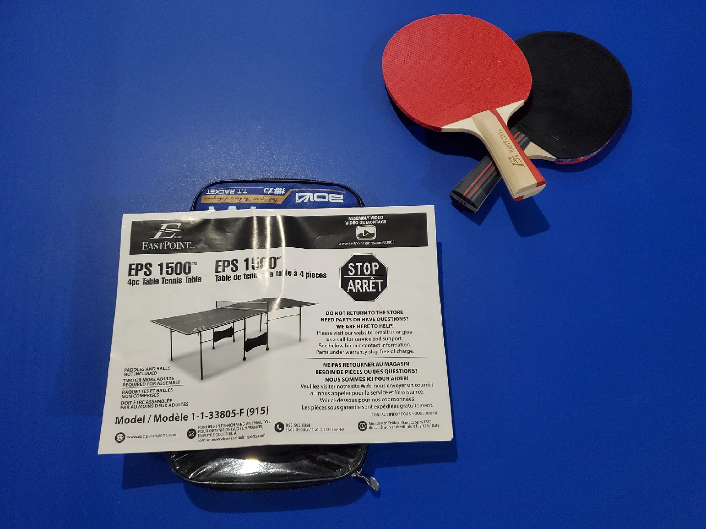 Selling an EastPoint EPS 1500 4pc table tennis table. Also included are two paddles and the assembly manual. The model number is 1-1-33805-F (915)
