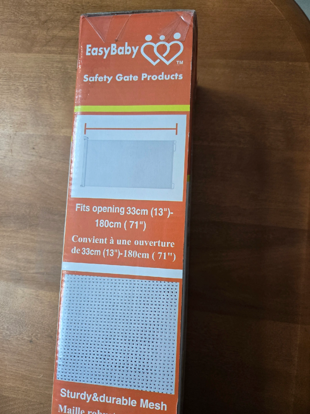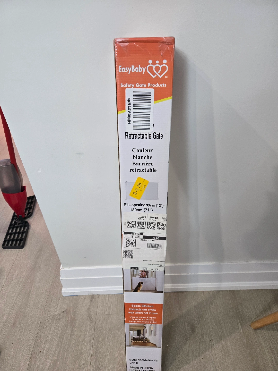 Selling an EasyBaby retractable safety gate, brand new in box! - Fits openings 33cm (13") - 180cm (71") - Sturdy & durable mesh - Space efficient design for doorways and hallways - Retractable gate
