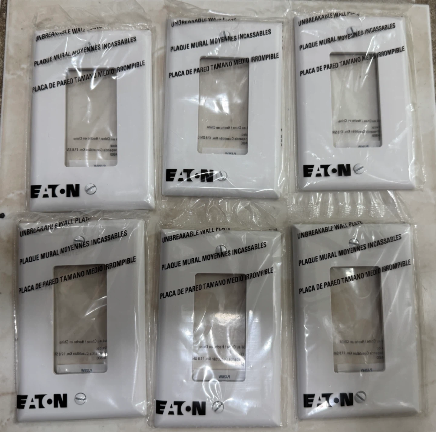 Selling six Eaton unbreakable wall plates, still in their original packaging. These are single-gang size and are made to be durable. They're white and ready to install. Price $ 3/- each.