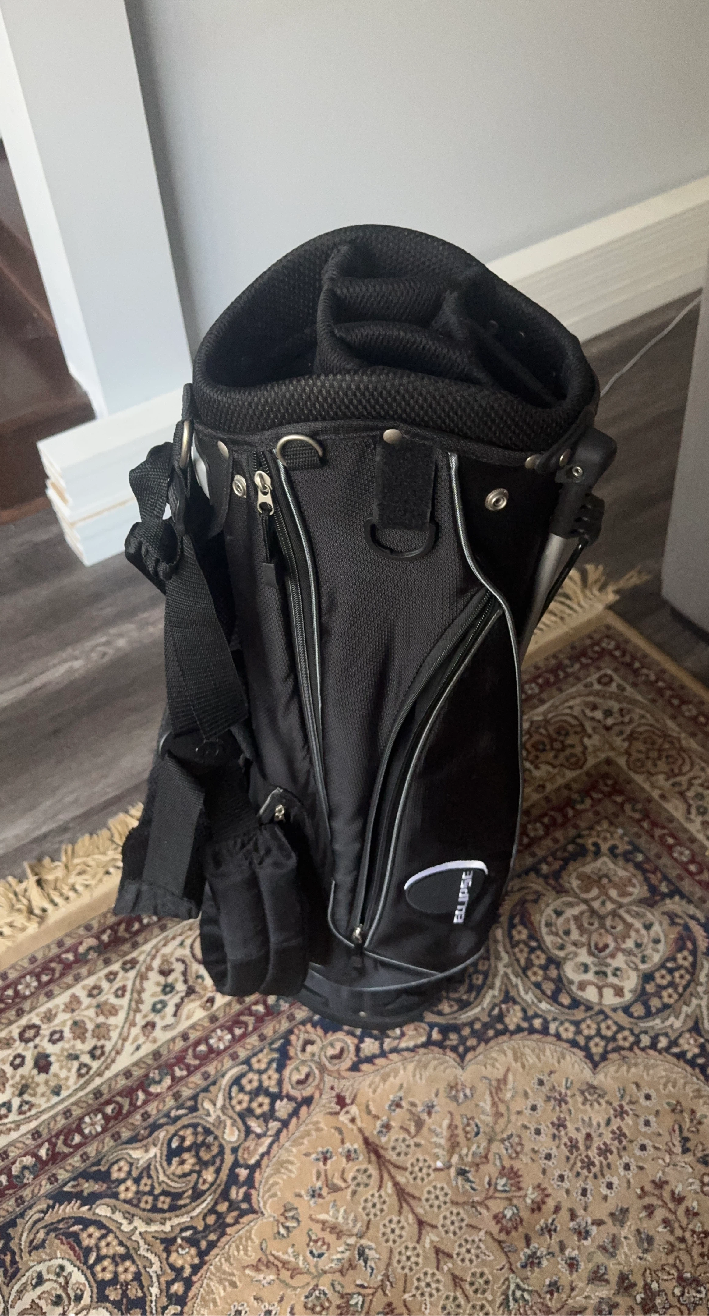 Selling a black Eclipse golf bag in good condition. It has several zippered compartments and a convenient carrying strap. Perfect for hitting the links!