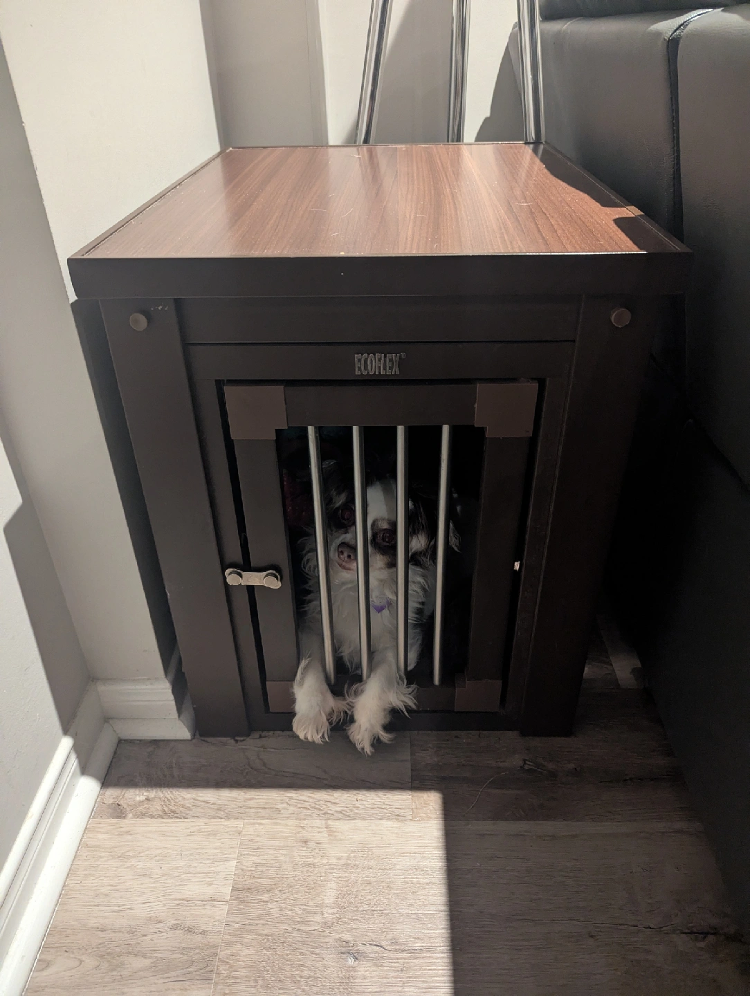 Selling an ECOFLEX dog crate end table! It's a stylish and functional piece. The crate is made of a durable composite material and doubles as an end table. Perfect for your furry friend and your living space. f