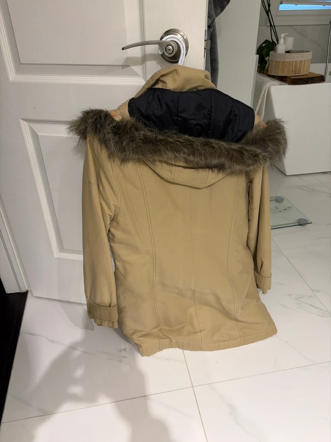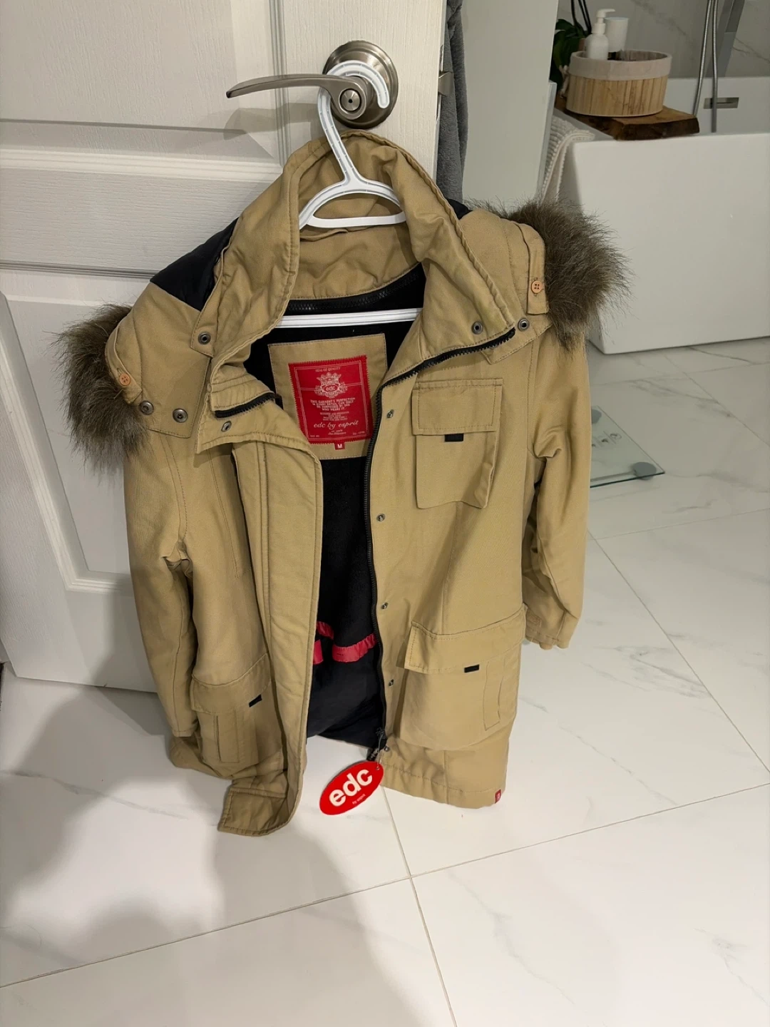 Selling an edc by Esprit jacket in size M. It's a stylish jacket with a fur-trimmed hood, perfect for staying warm and looking great! The jacket features a black lining and a beige outer colour with tag