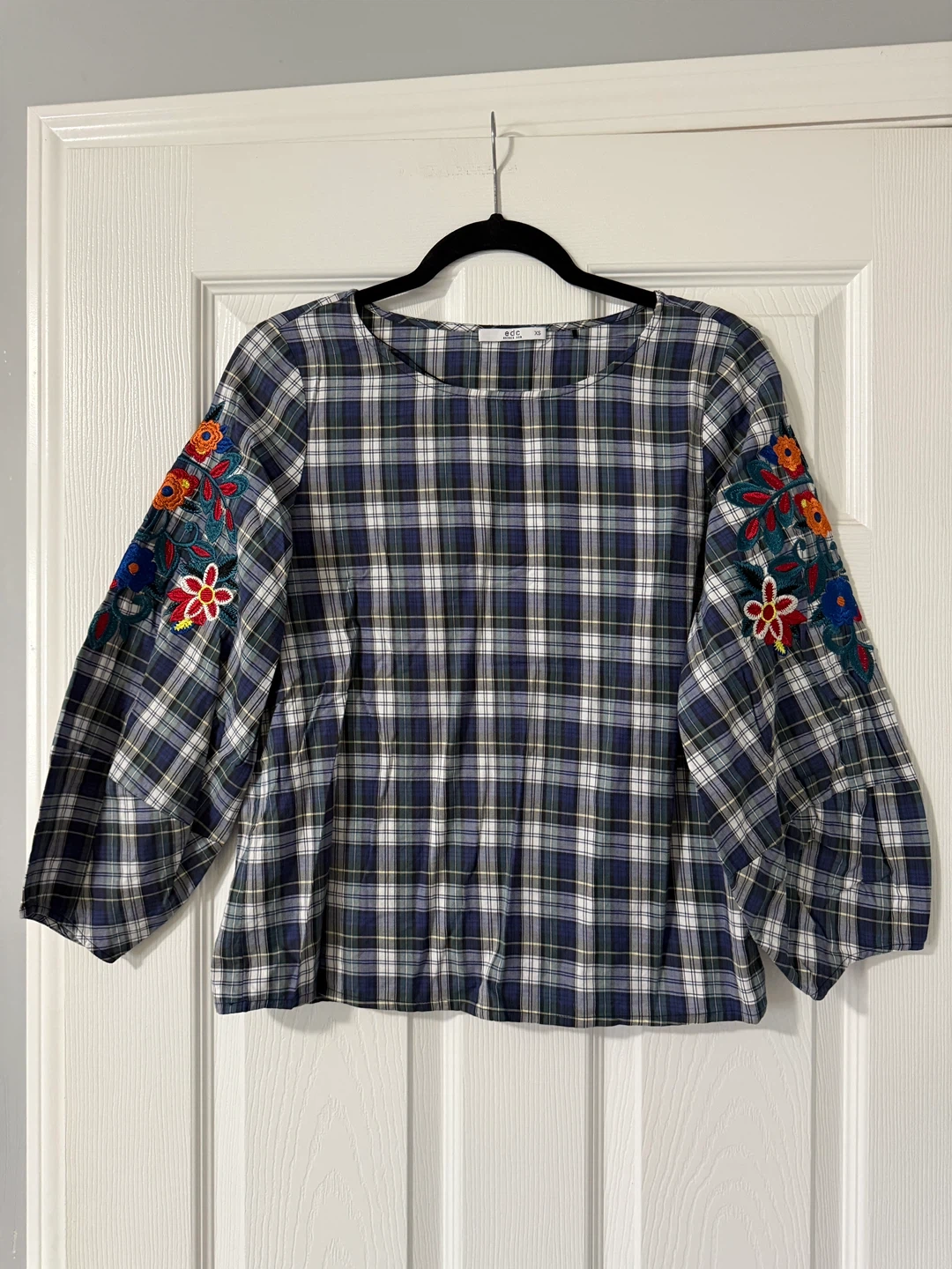 This edc blouse is a stylish addition to any wardrobe! It features a classic plaid pattern in shades of blue, green, and white. The sleeves are beautifully embroidered with colourful floral designs. It's a size XS and in great condition!