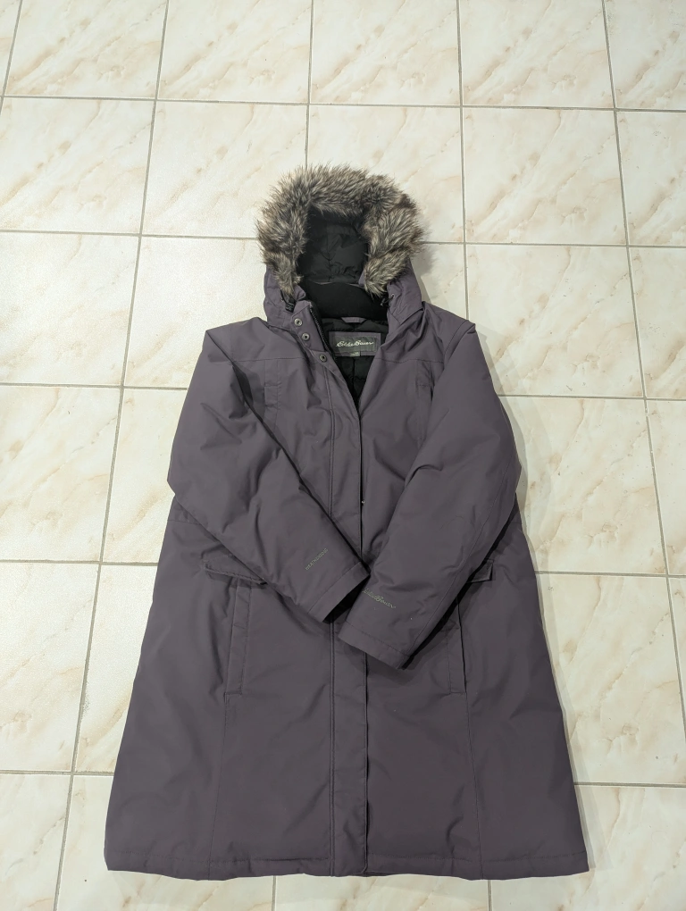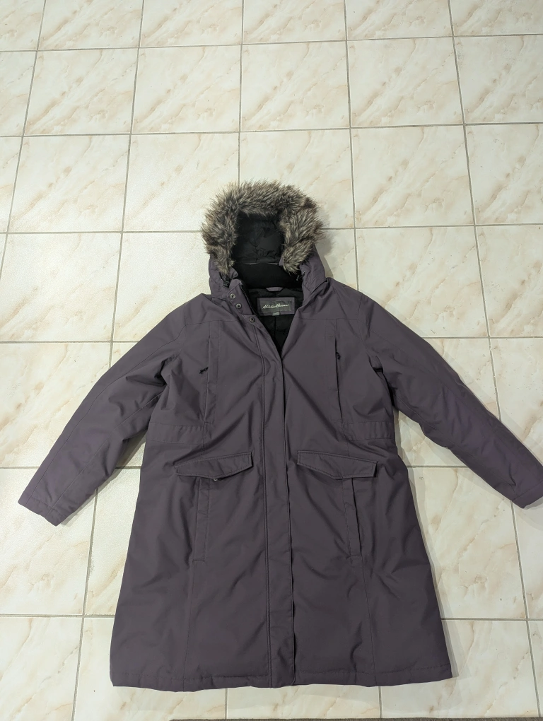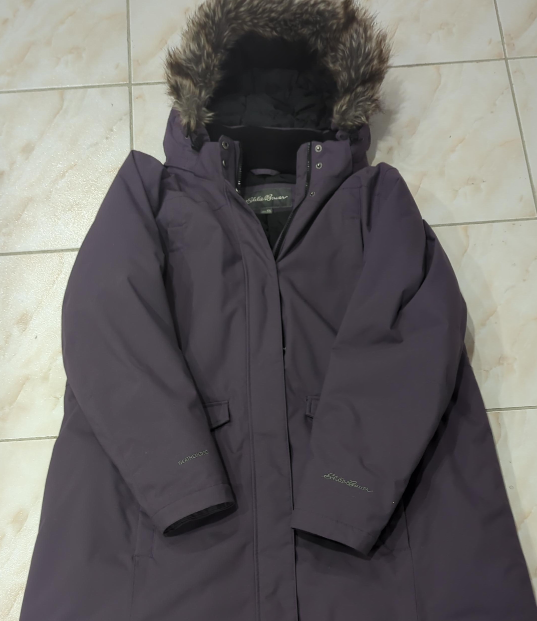 Eddie Bauer WeatherEdge parka in a lovely plum colour. It has a faux fur trim on the hood and is in great condition. Perfect for our Canadian winters!