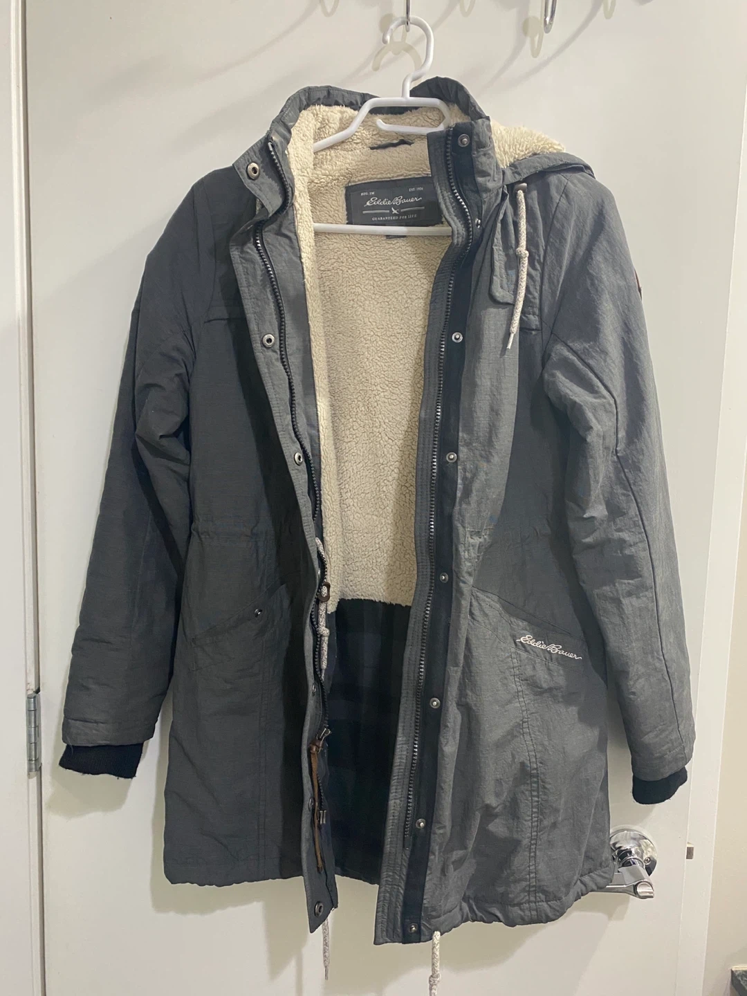 Eddie Bauer parka in great condition! It's a size small and features a cozy, sherpa-lined hood. Perfect for staying warm during the colder months! Woman Medium