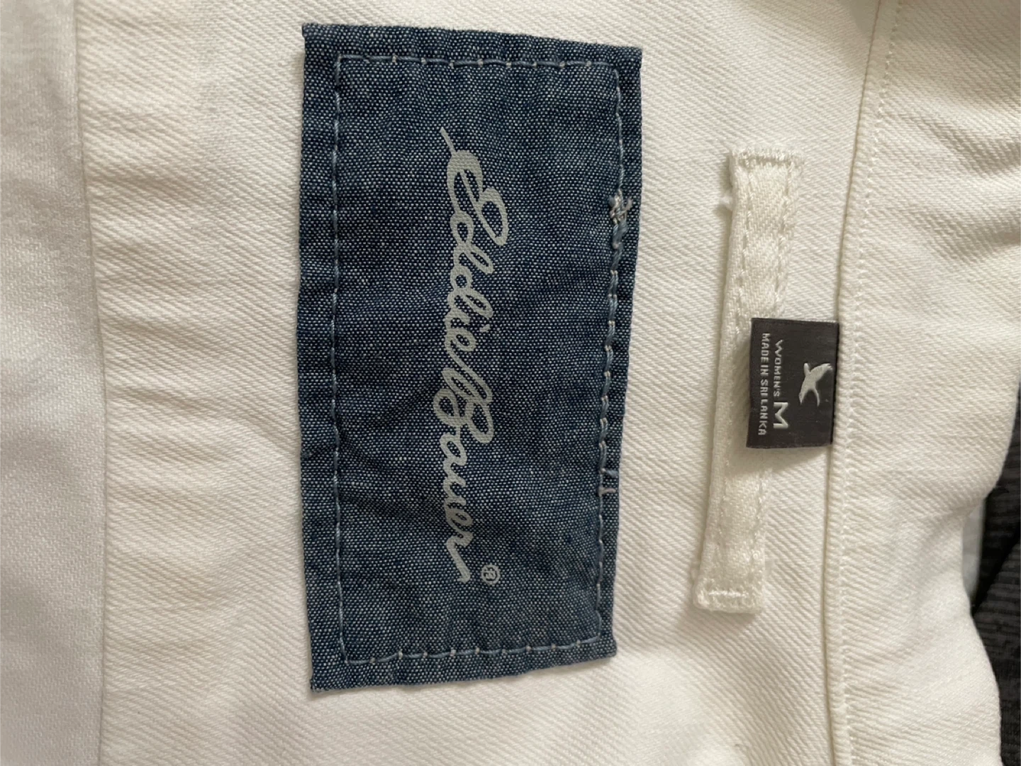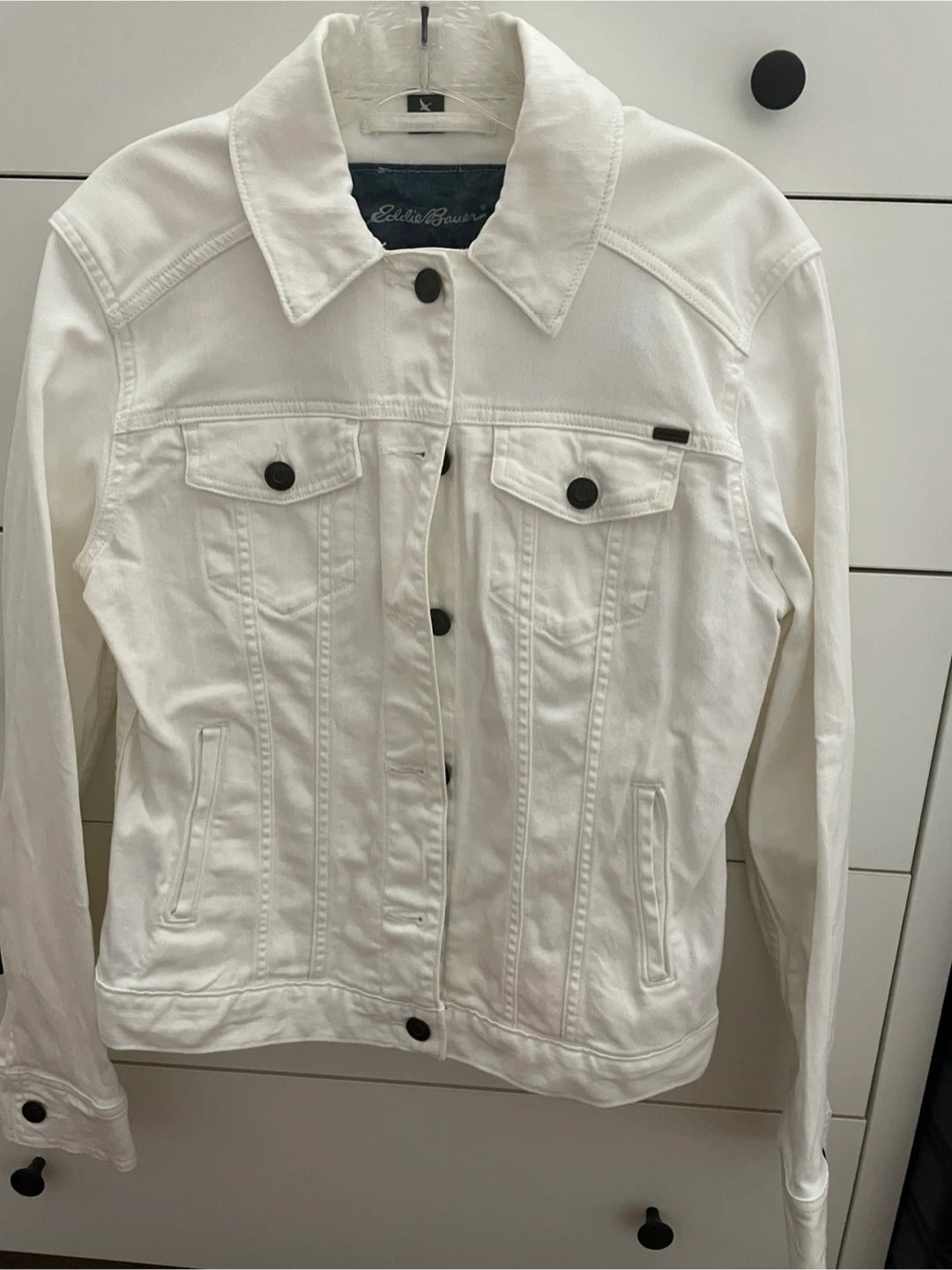 Selling a gently used Eddie Bauer women's denim jacket in white. It's a size medium and in great condition. Perfect for layering or wearing on its own!