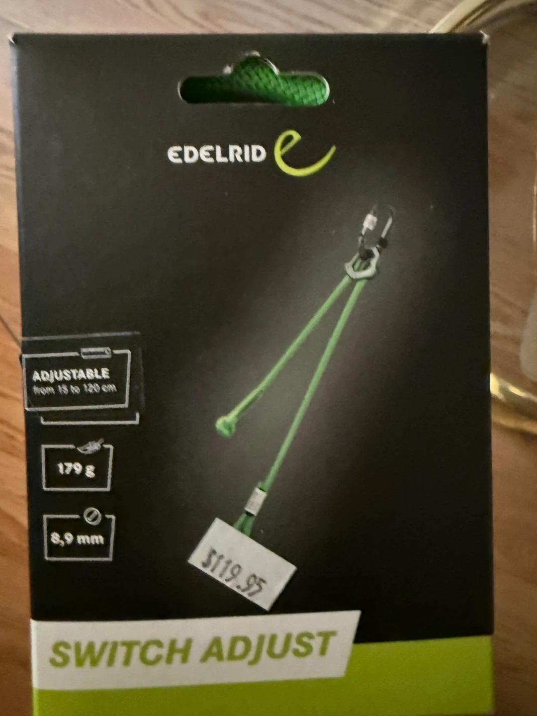 Selling a brand new Edelrid Switch Adjust climbing lanyard, still in its original packaging! This adjustable lanyard is perfect for climbing and mountaineering. It's adjustable from 18 to 120 cm, weighs 179 g, and has a diameter of 8.9 mm. Originally priced at $119.95, this is a great deal!