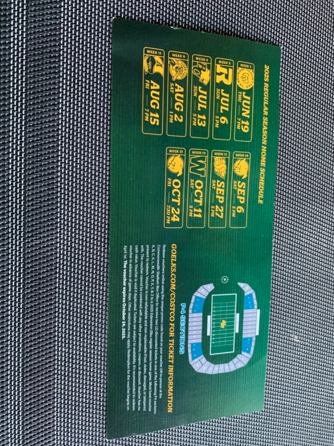 Selling a voucher for two tickets to an Edmonton Elks game! This voucher is valid for the 2025 regular season home games. Ticket information can be found at goelks.com/costco. The voucher expires October 24, 2025