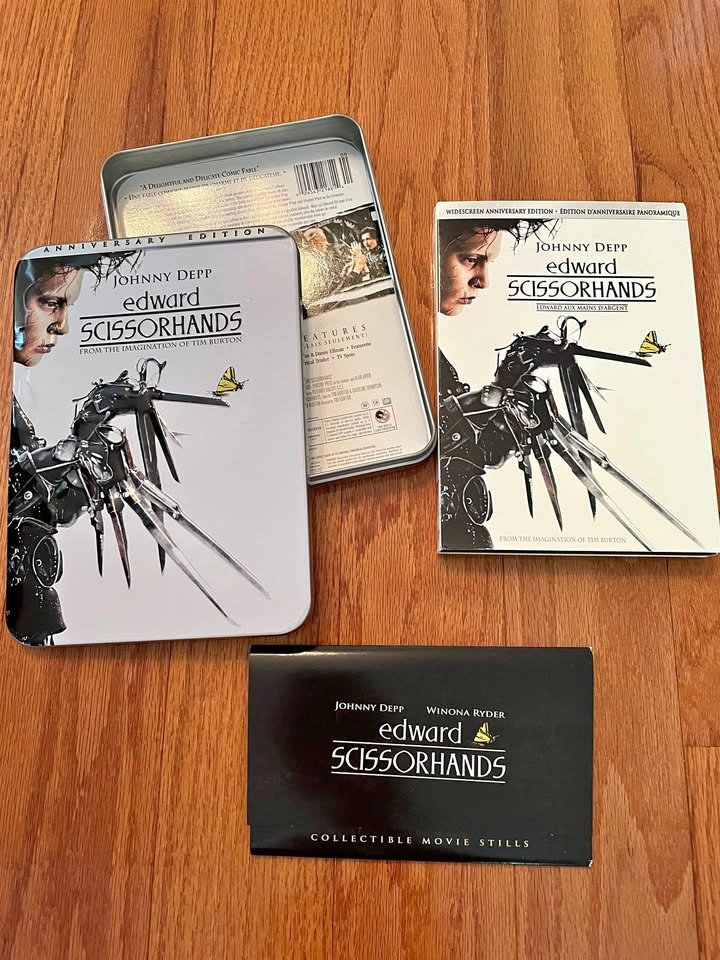 Celebrate Tim Burton’s classic with this Edward Scissorhands Anniversary Edition Collectible Set. Includes: • Widescreen Anniversary Edition DVD • Collector’s Tin Case featuring artwork of Johnny Depp as Edward • Collectible Movie Stills Pack Perfect condition! Authentic 20th Century Fox release. This is a must-have for fans of Tim Burton, Johnny Depp, or collectors of iconic 90s films.
