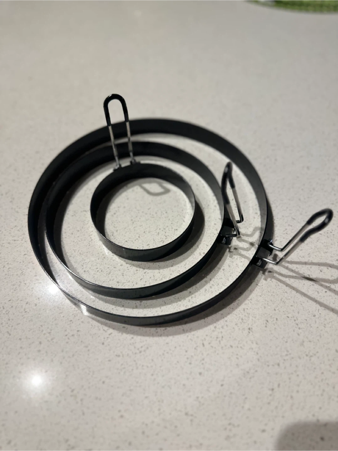Selling a set of three egg rings! They're black and in great condition. Perfect for making eggs, pancakes, or even cookies. They come in three different sizes.