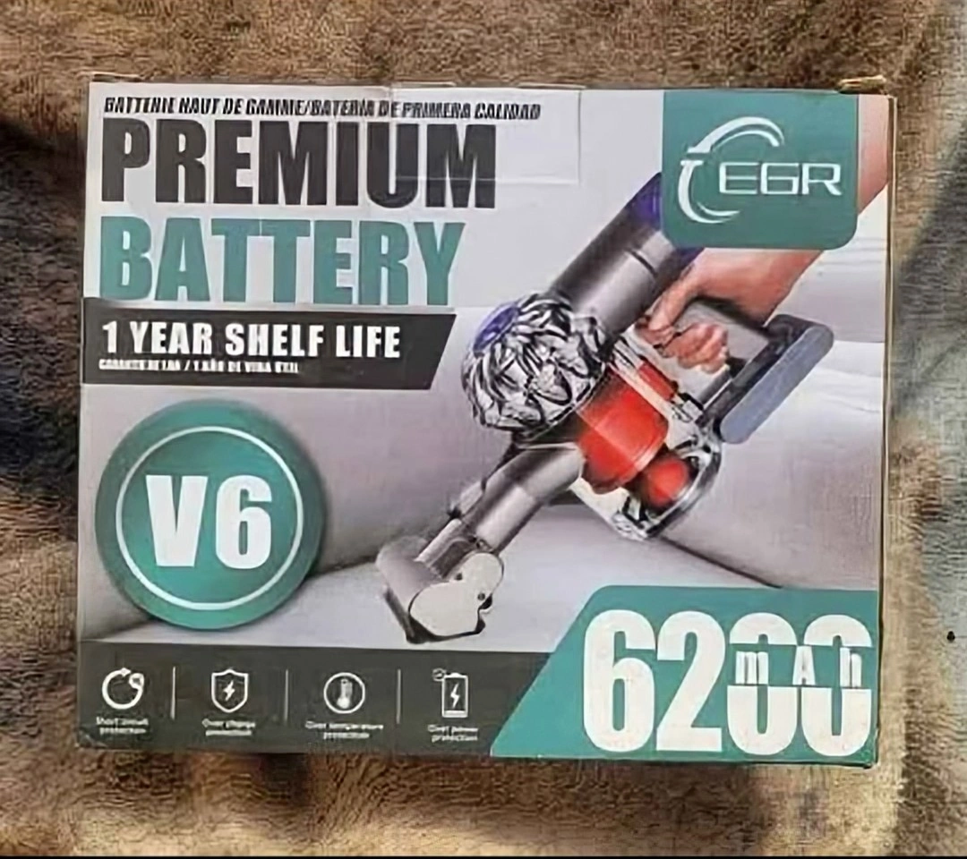 Long-Lasting V6 Rechargeable Battery; NEVER BEEN USED. BRAND NEW IN BOX - NEVER BEEN OPENED Voltage: 21.6V Capacity: 6200mAh Power: 133.92Wh. The V6 battery replacement is usable for up to 23 minutes in normal mode and up to 5 minutes in high-performance mode. Huge Compatibility: This battery replacement is compatible with V6, SV03, SV04, SV05, SV06, SV07, SV09, VTC4, DC58, DC59, DC61, DC62, DC72, DC74, V6 Trigger, V6 Animal, V6 Motorhead, V6 Fluffy, V6 Absolute battery. (NOT Fit V7, V8) The battery replacement v6 is equipped with a non-slip strip. The non-slip strip can play a good anti-skid effect when the vacuum cleaner is leaned against the wall and prevent the vacuum cleaner from falling down. Products include 1*V6 Replacement battery, 1*Battery dust cover, 1*Screwdriver and 2*Screws. 3*Pre-filter and 1*Post-filter. Asking $40 obo Pickup in Clayton Heights, cash only