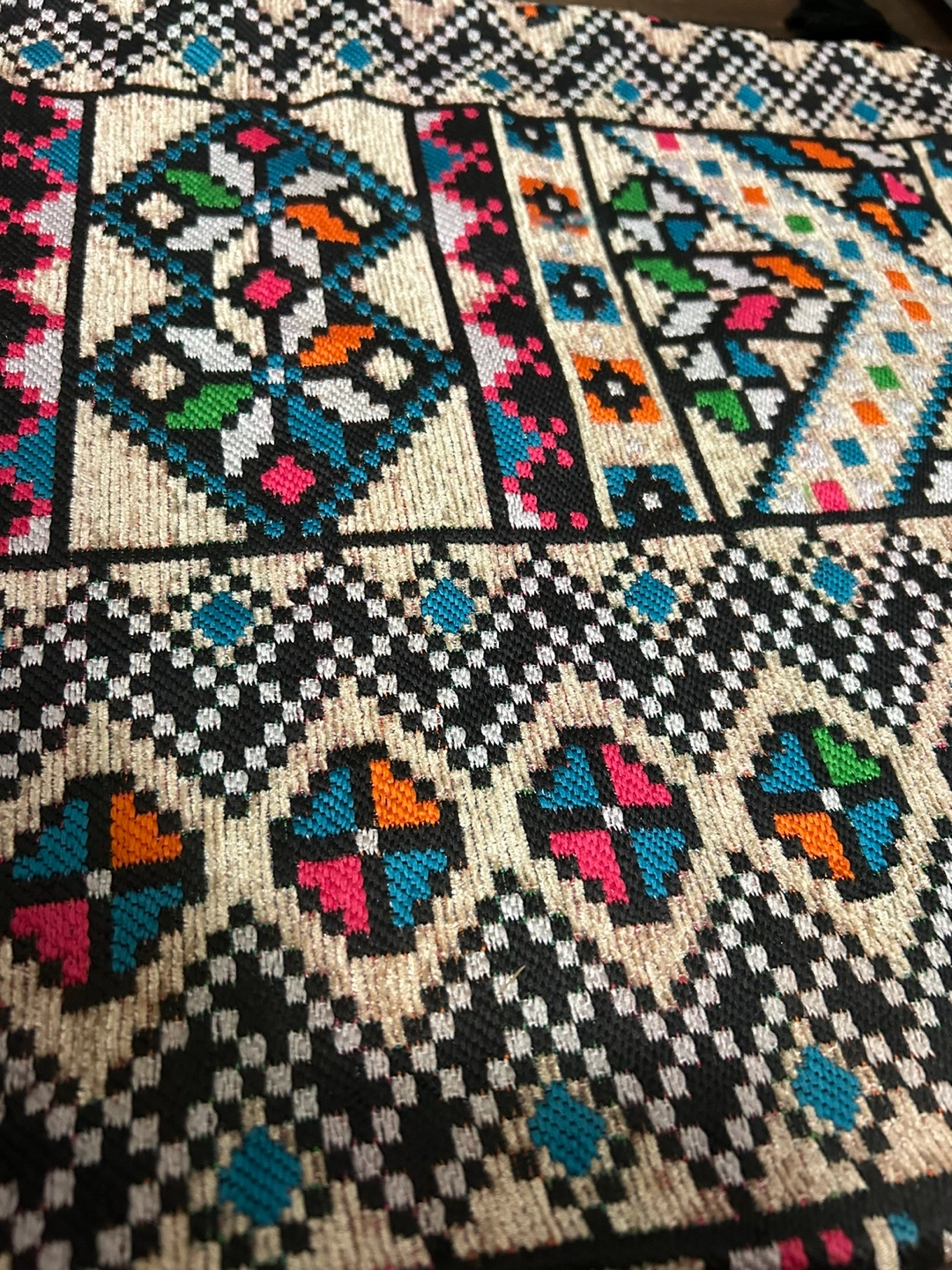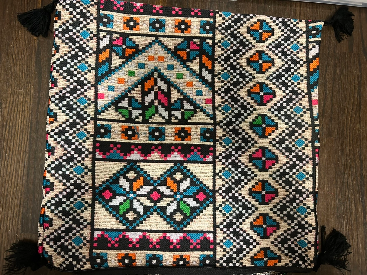 Brand new, opened to take pictures. This is a beautiful cushion cover, embroidered in bright cotton thread. Tassels at each corner. Cushion cover is 45cm x 45cm