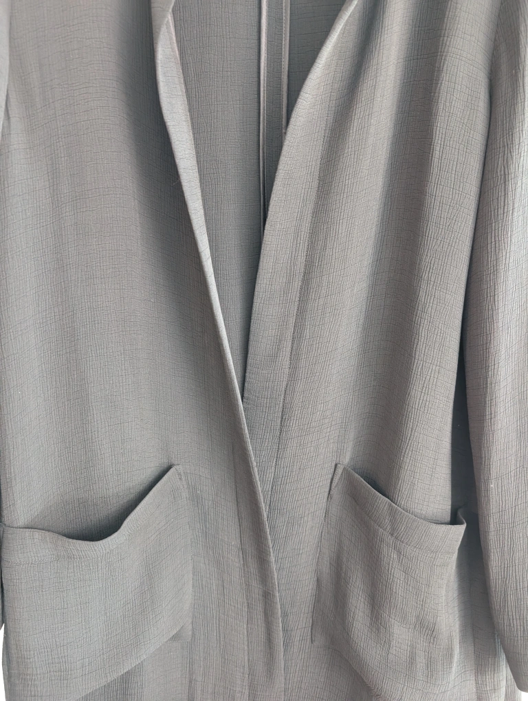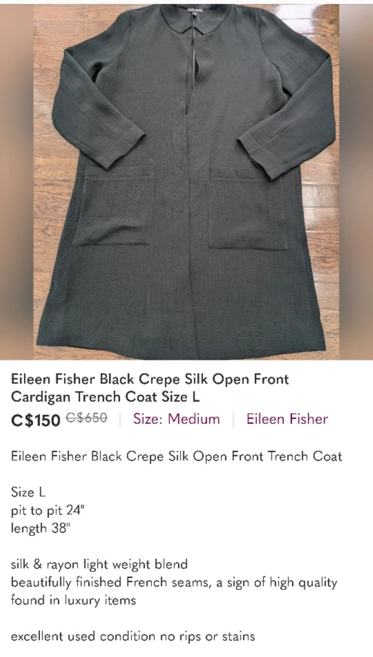 Selling a stylish Eileen Fisher jacket in size L! silk rayon light weight open front French seams pit to pit 24" length 38" excellent used condition