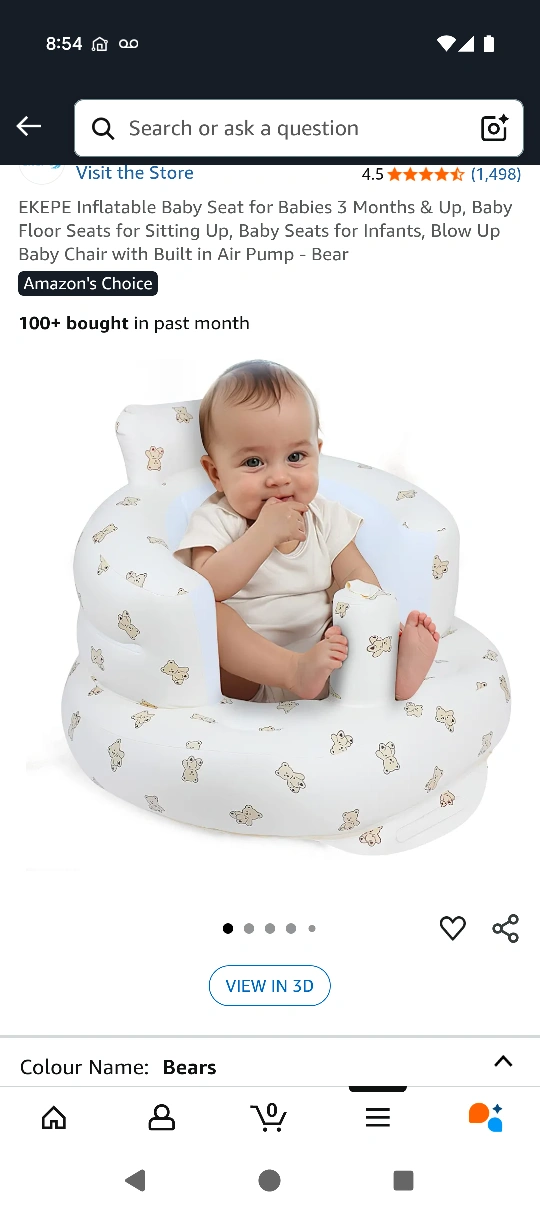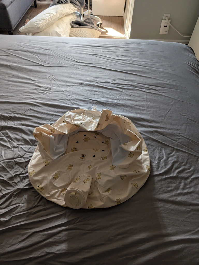 Here's a gently used EKEPE inflatable baby seat, perfect for babies 3 months and up! It's great for helping your little one sit up and explore their surroundings. This one features a cute bears design. It has a built-in air pump for easy inflation and deflation