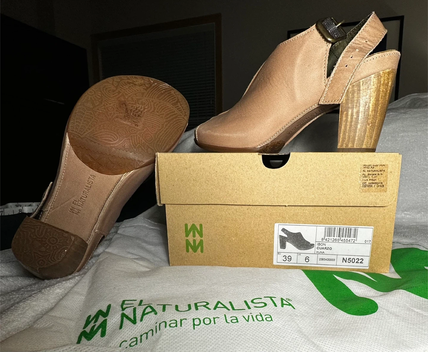 Selling a pair of El Naturalista Ibón Cuarzo heels in size 39. These stylish heels feature a unique wooden heel and a comfortable cork insole. The upper material is made of high-quality leather. Brand-new and comes with the original box!