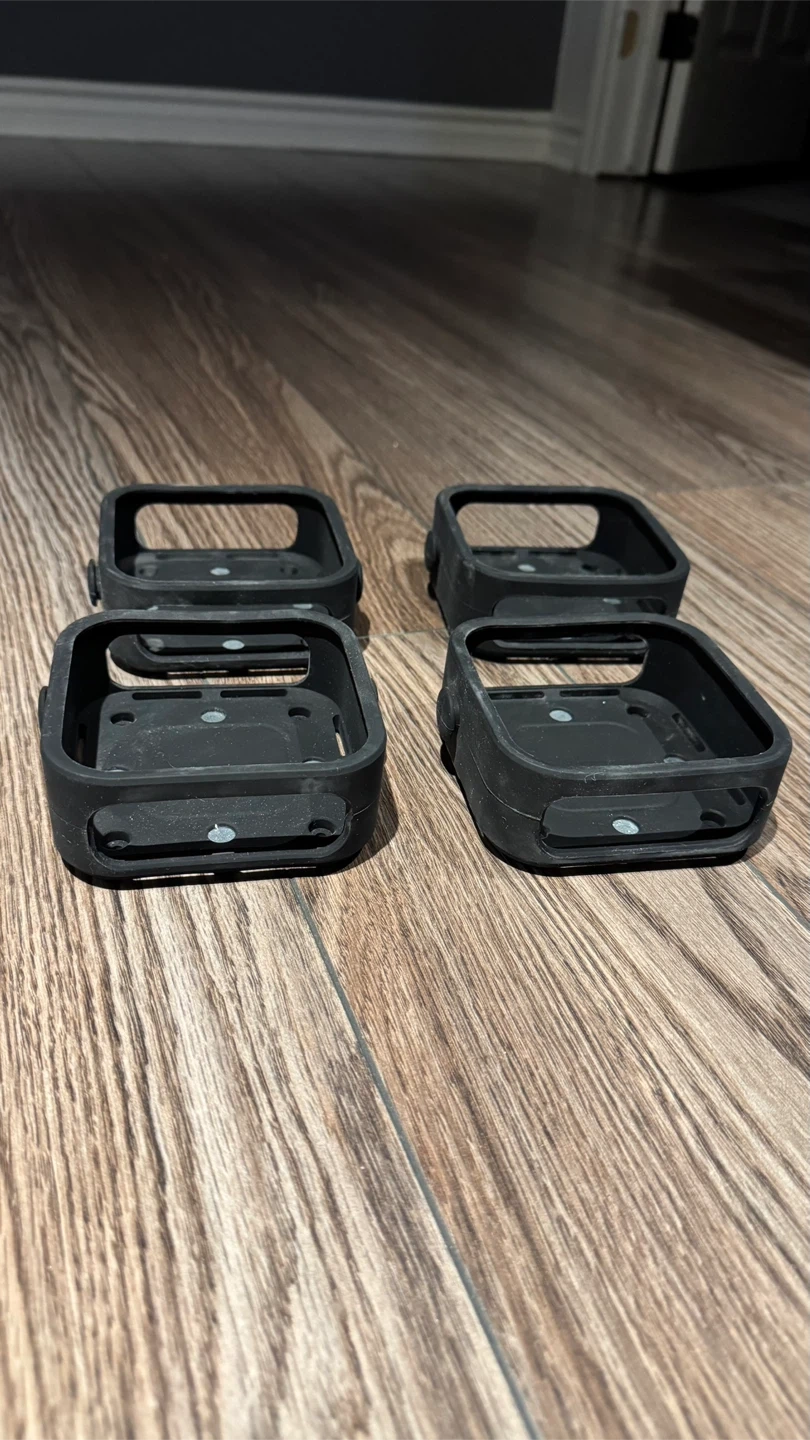 Elago Apple TV mount. You can hang, screw or use magnets to hang the Apple TV. Great for hiding behind a TV. Four available. Asking $15 each or $50 for all four. Does not come with hanging strap.