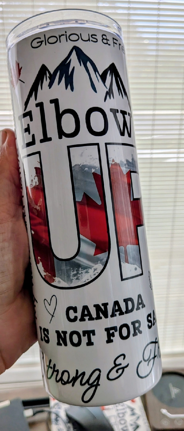 Tumbler with an 'Elbows UP' design featuring the Canadian flag and mountains. 20 oz hot /cold pick up Welland