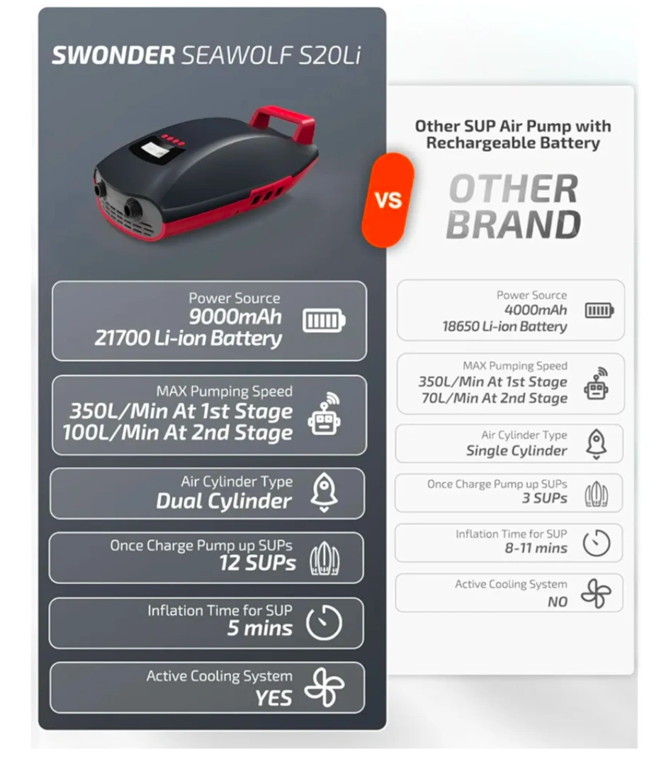 Inflate your paddle boards and more with this SWONDER SEAWOLF S20Li electric air pump, boasting a robust 9000mAh battery! Key Features: 9000mAh Battery: Long-lasting power for multiple inflations. 350L/Min Pumping Speed: Quickly inflates at the 1st stage, with 100L/Min at the 2nd stage. Dual Cylinder: Efficient air compression. Inflates up to 12 SUPs on a Single Charge: Great for group outings. Fast Inflation: Inflates a SUP in just 5 minutes. Active Cooling System: Prevents overheating during extended use. Power Bank Function: Can charge phones and other devices. If you're seeing this ad, it's still available! Pick up near the intersection of Kipling and Eglinton. Currently cost $220 before taxes.