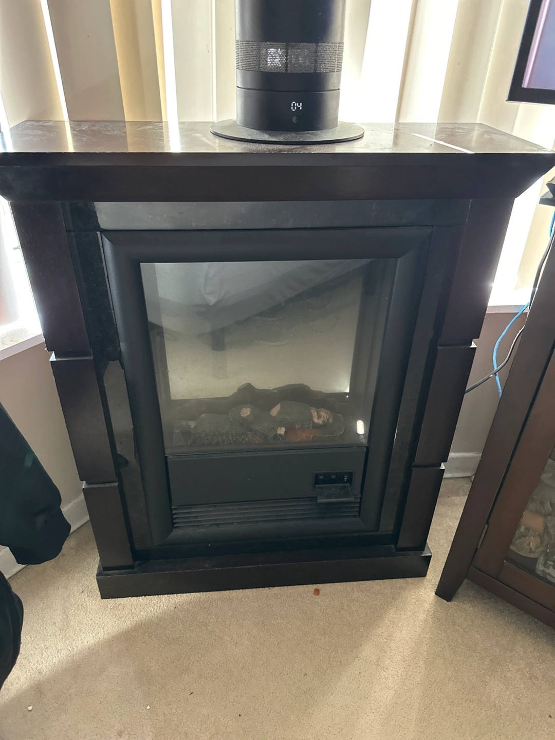 Freestanding electric fireplace. Dark brown wood-like finish. Features realistic flame effect. Good condition.
