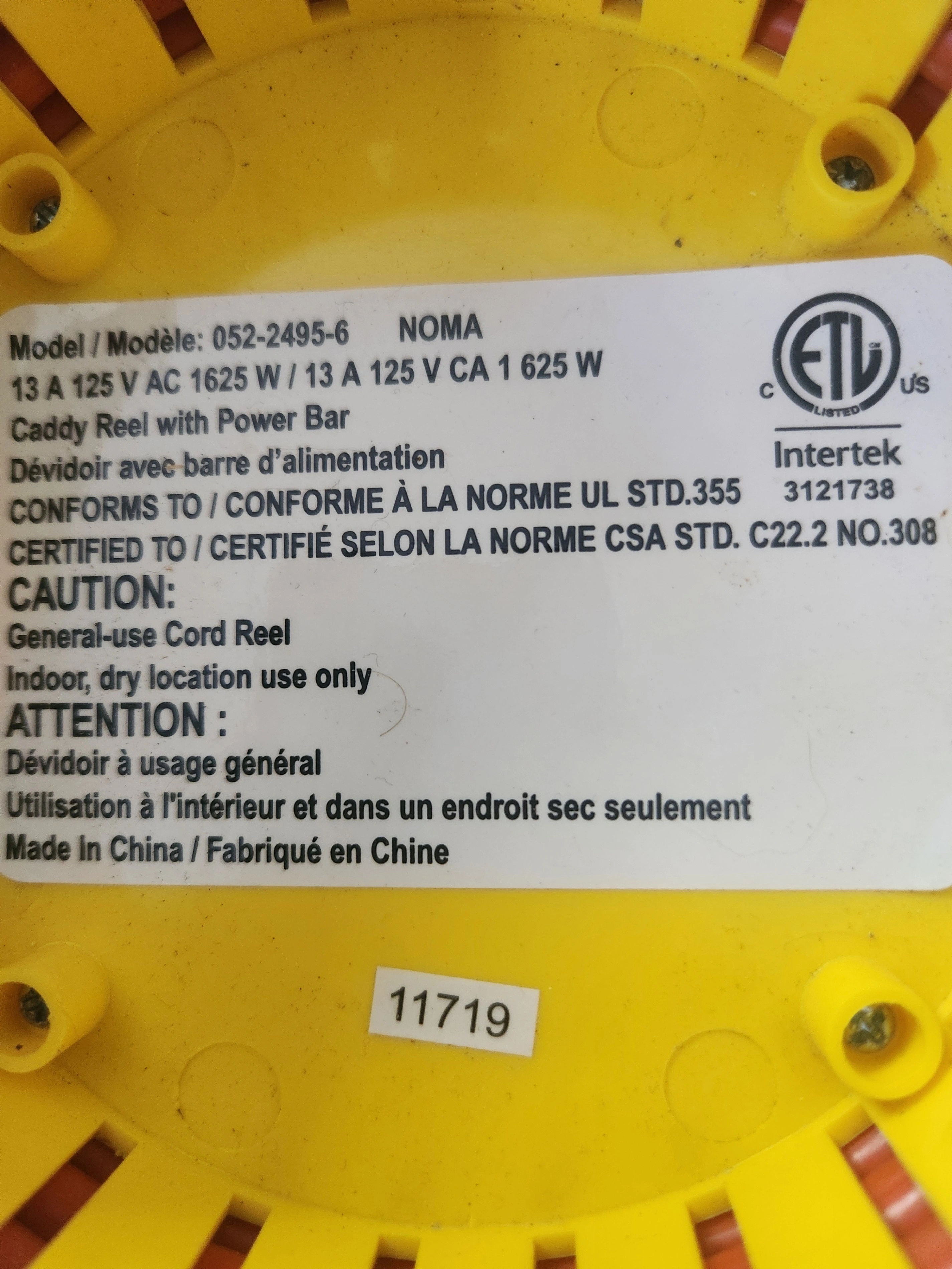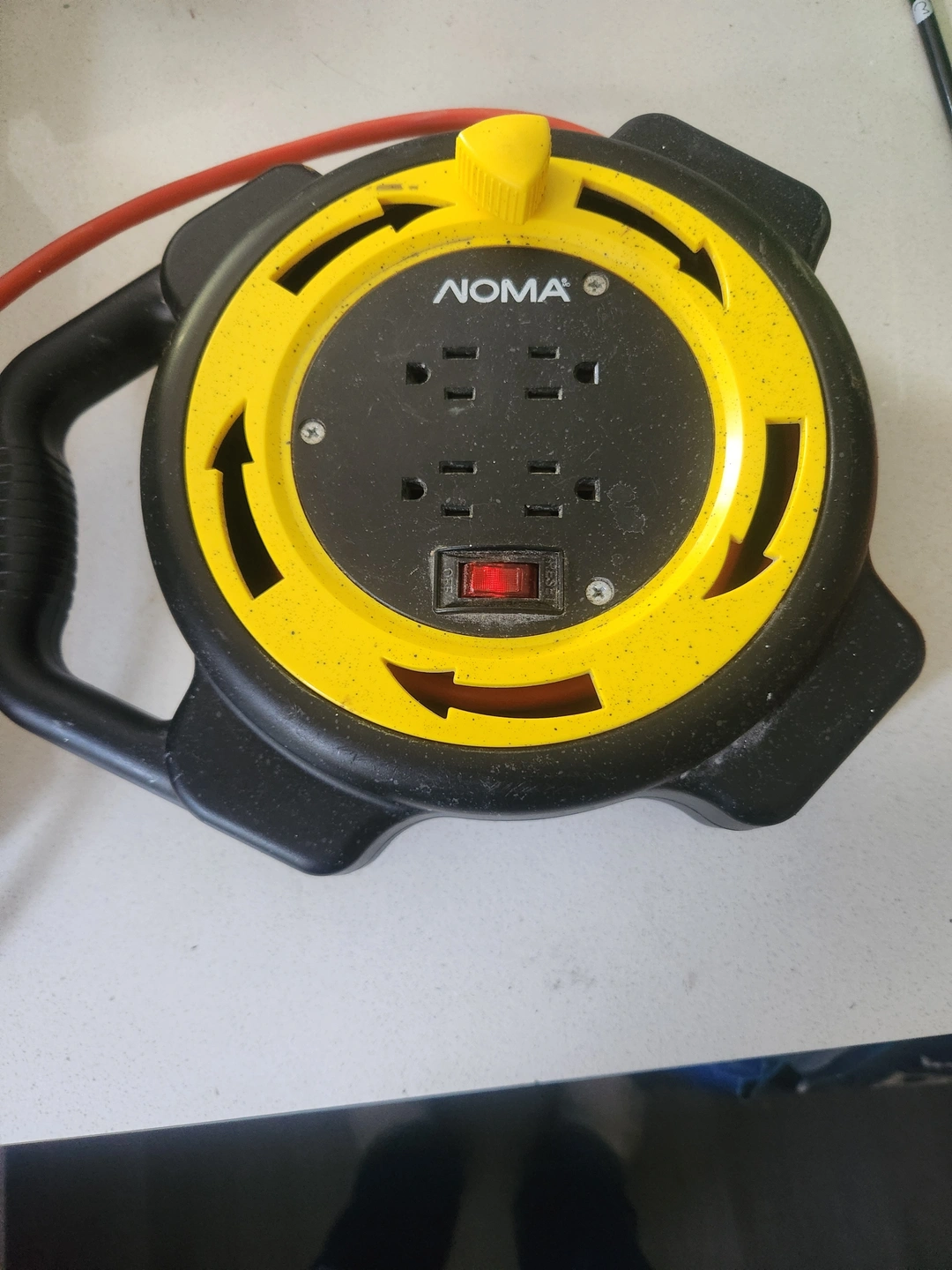 For sale: NOMA 25' caddy reel with power bar, model 052-2495-6. It has four outlets with a power switch and is rated for 13A / 125V / 1625W. All outlets have been tested and are working properly. In good condition and lightly used.