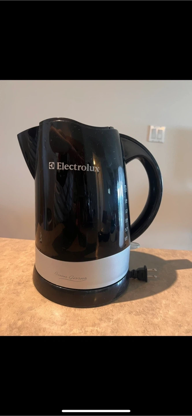 Selling a black Electrolux electric kettle. It has a "Buon Giorno" design on the base. It is in used condition.