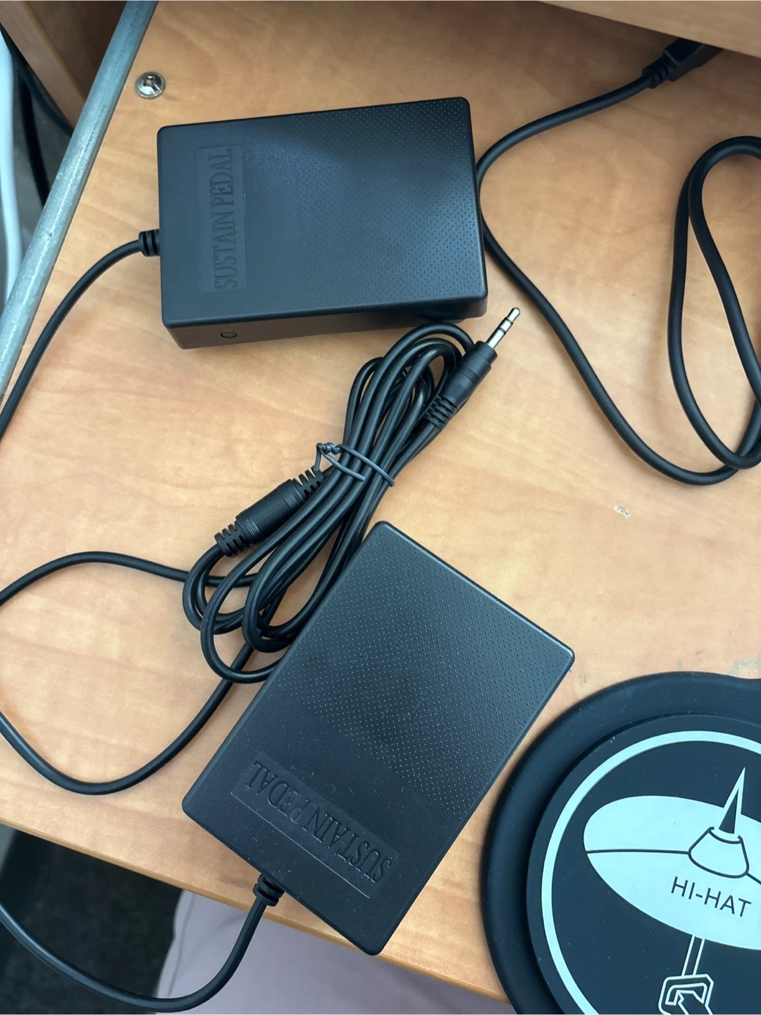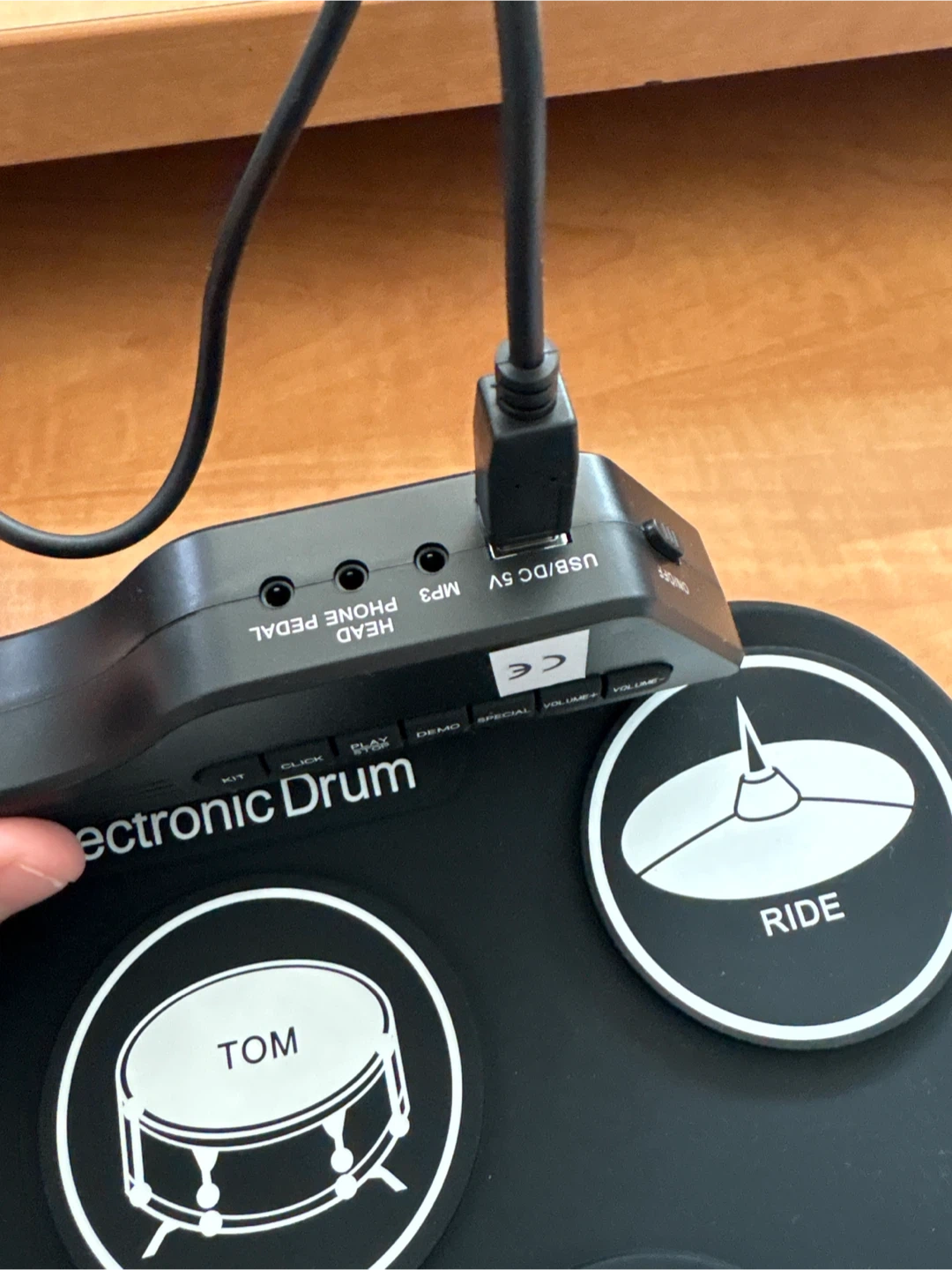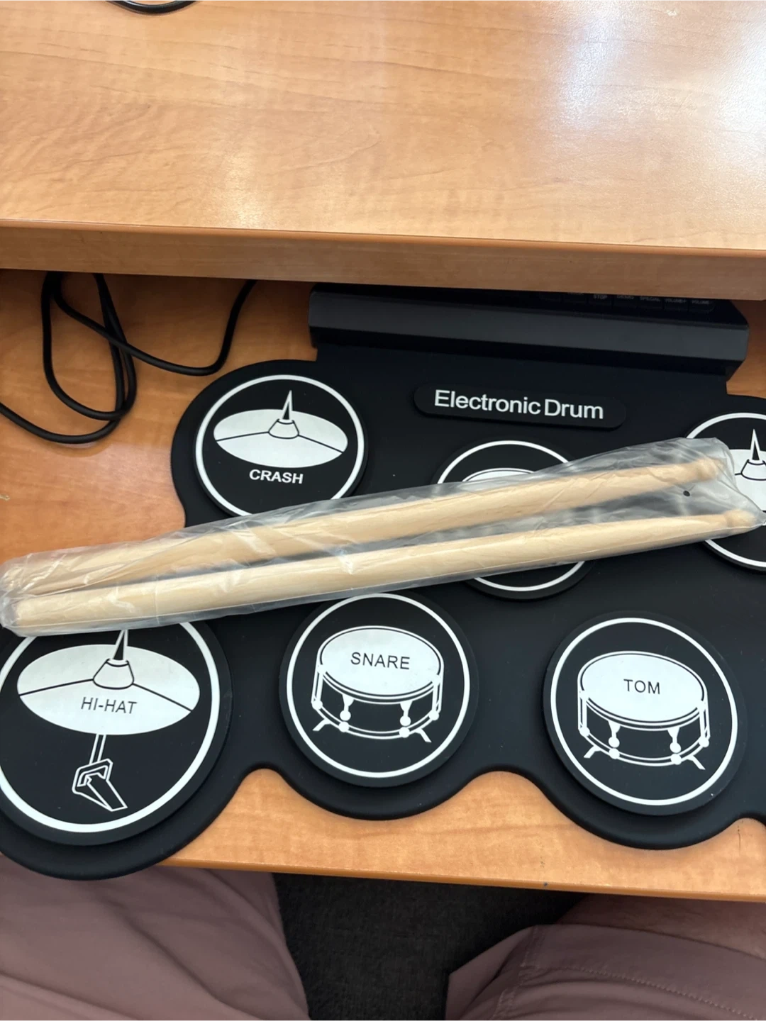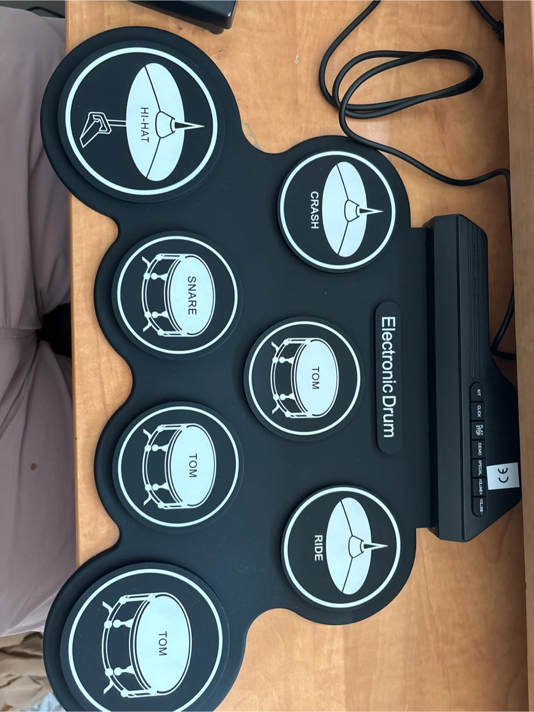 Selling a portable electronic drum set! It's a roll-up kit, making it super easy to store and take with you. Comes with drumsticks and sustain pedals. Perfect for beginners or anyone who wants to practice on the go
