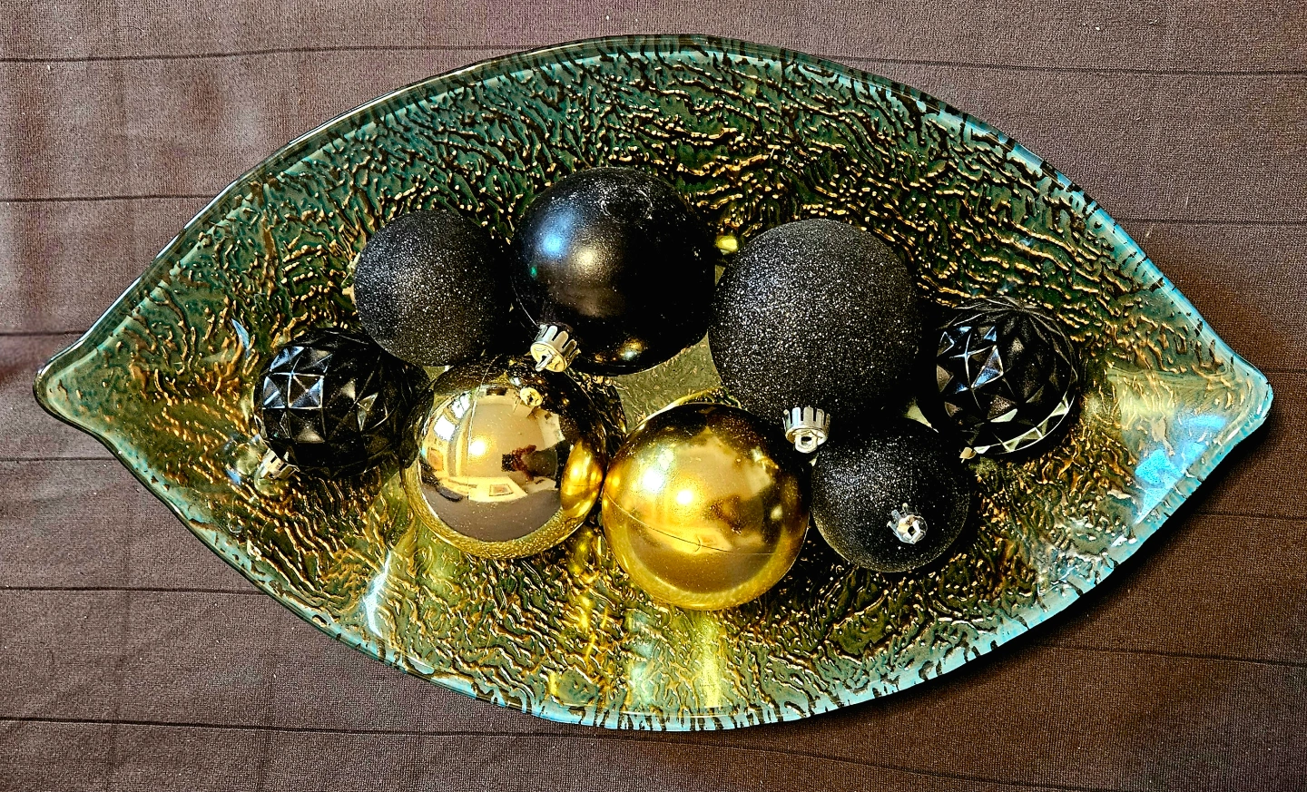 Unique decorative bowl. Features a textured, teal and gold finish. Contains several gold and black Christmas ornaments. Perfect for a stylish centerpiece. From a smoke-free, pet-free home. Bundle discounts are available—feel free to browse my other listings. Thanks for looking! 😊🙏