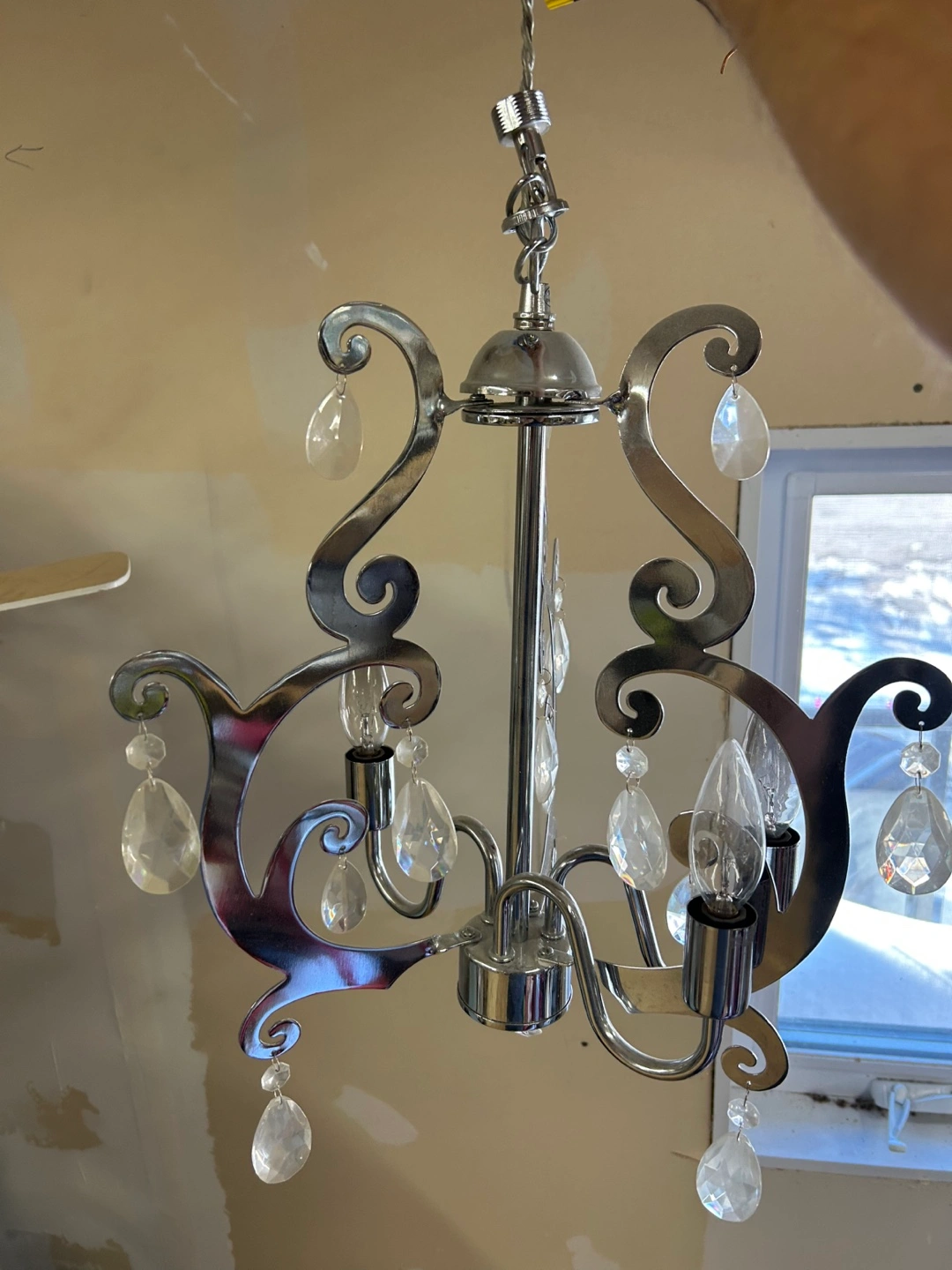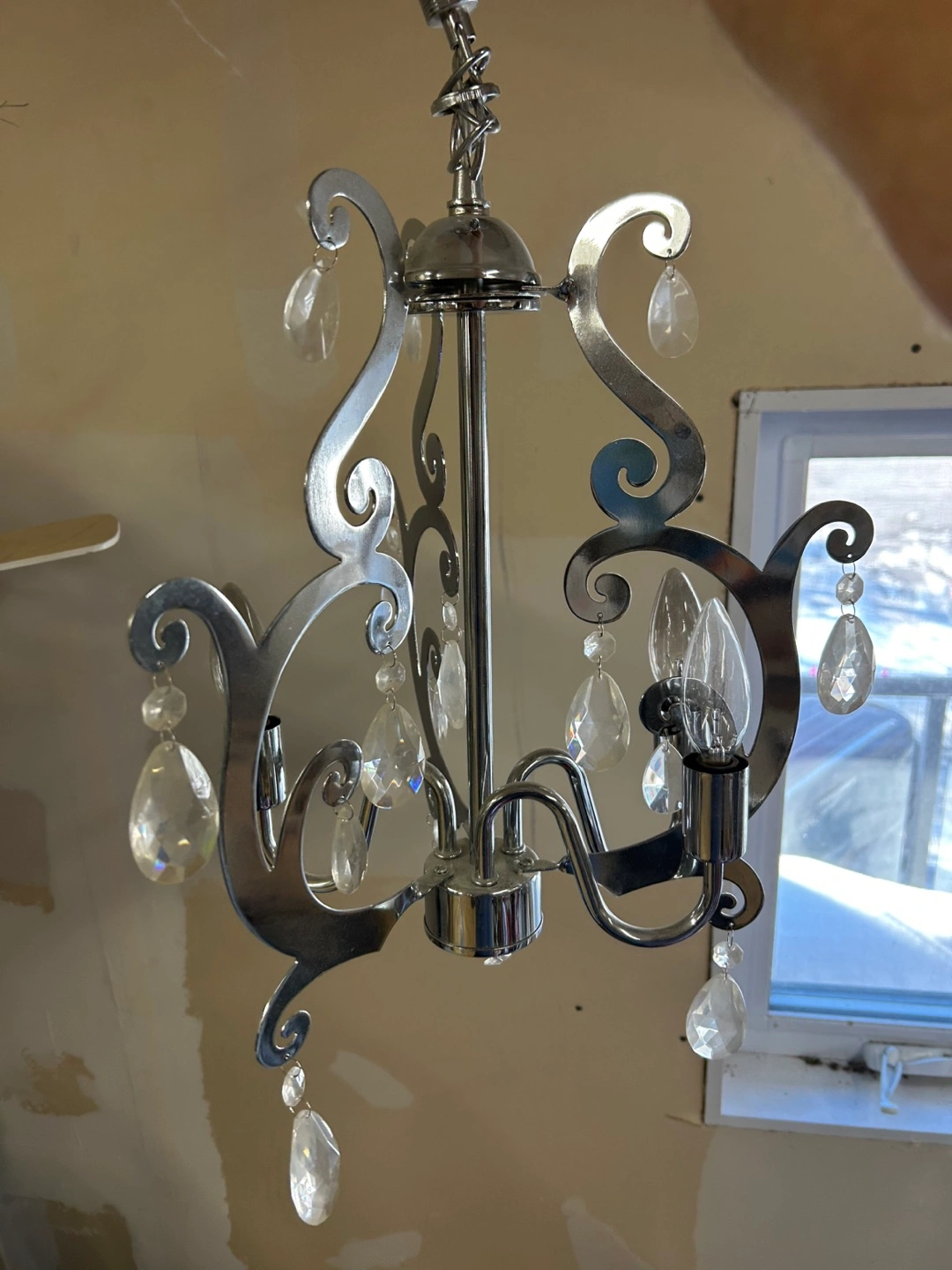 Beautiful chrome chandelier. Three lights. Features crystal accents. Adds a touch of elegance to any room.