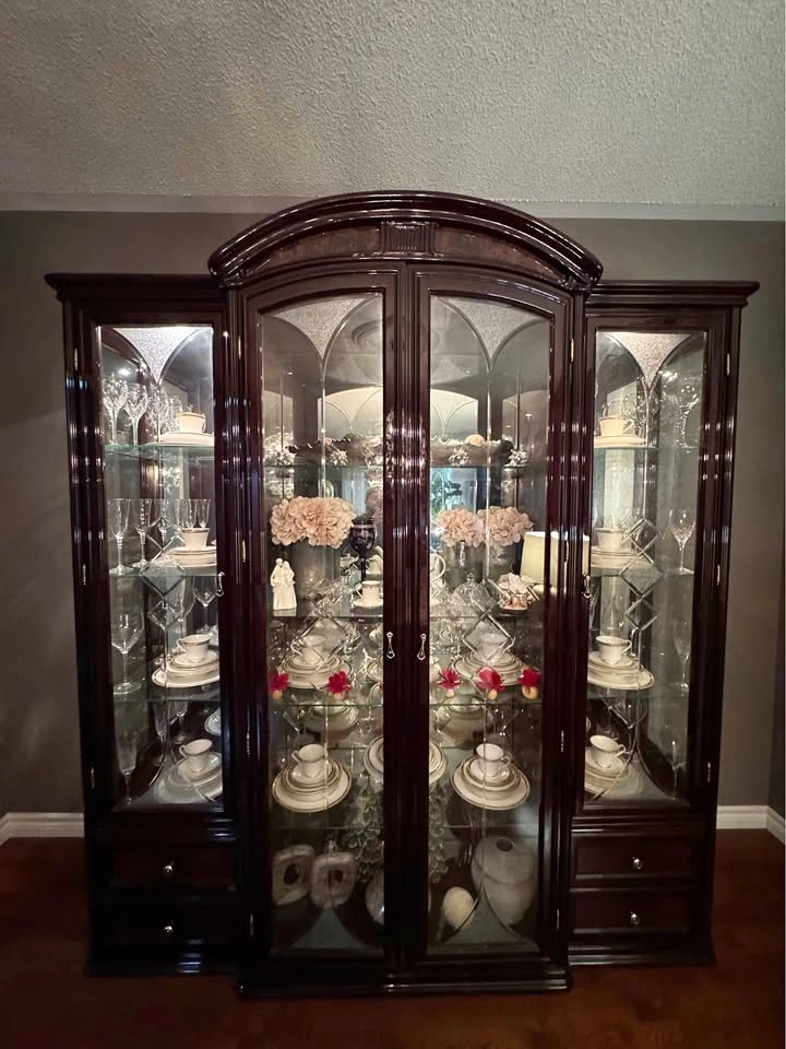 Beautiful Italian-crafted display cabinet made from rich, solid wood with stunning glass panels and built-in lighting that highlights your fine china, crystal, or collectibles. This elegant piece adds timeless sophistication to any dining or living space. Features: Genuine Italian craftsmanship Solid wood frame with detailed molding Glass shelves and mirrored back for enhanced display Built-in lighting for a warm, elegant ambiance Two side sections with drawers for extra storage Excellent condition – very well maintained Dimensions: Height: 87 ½ inches Length: 70 ½ inches Width: 14 ½ inches (double-check if you meant 4½ or 14½ – 4½ seems too narrow for a cabinet of this size) Condition: Gently used, beautifully preserved, smoke-free home. (Contents not included)