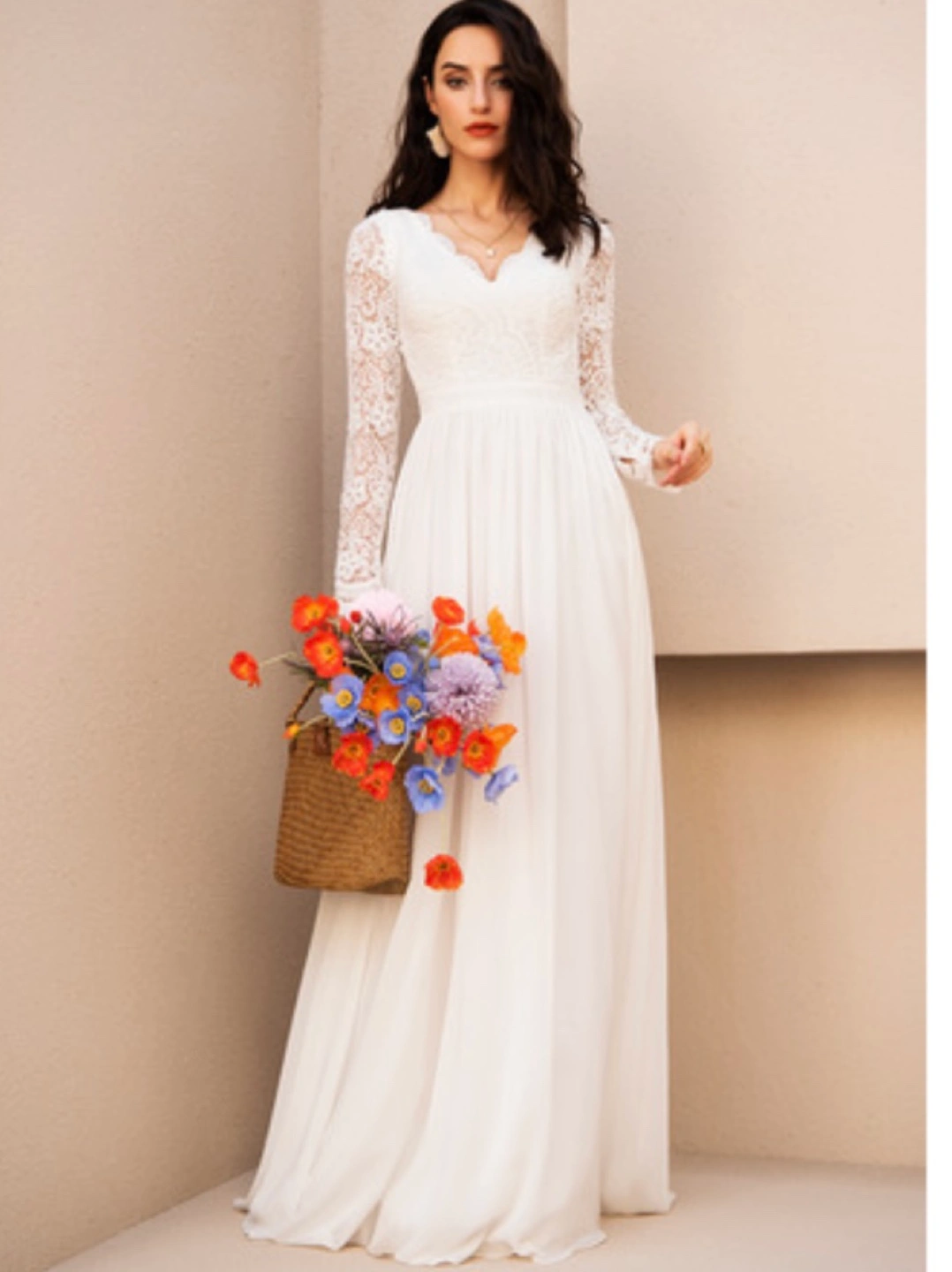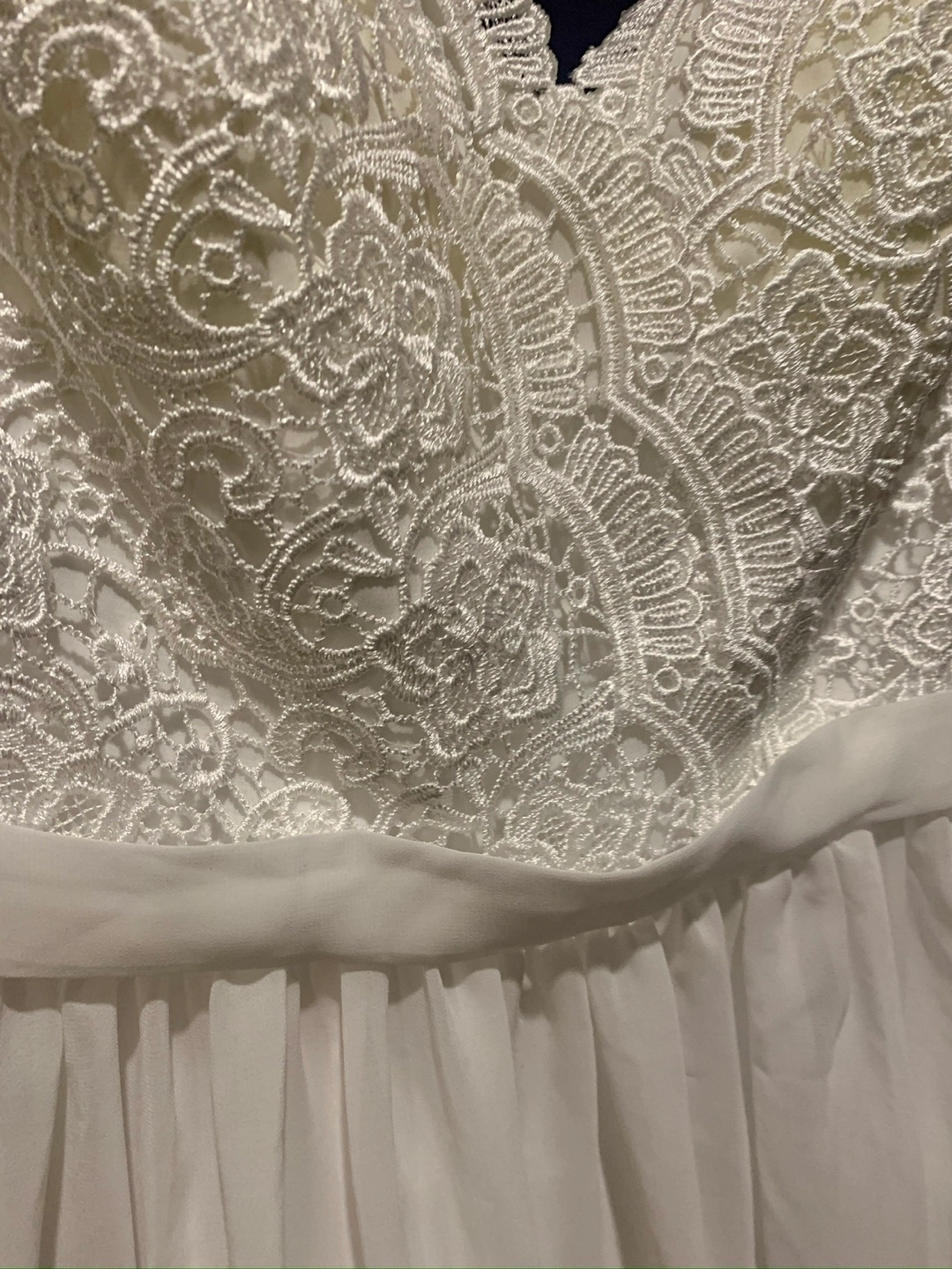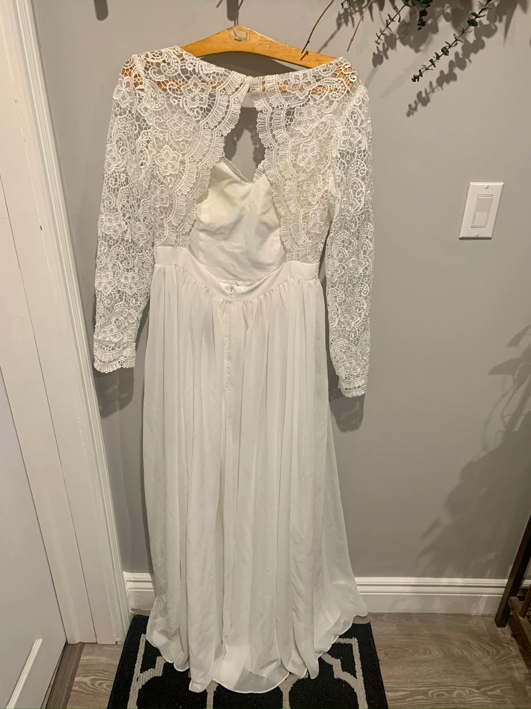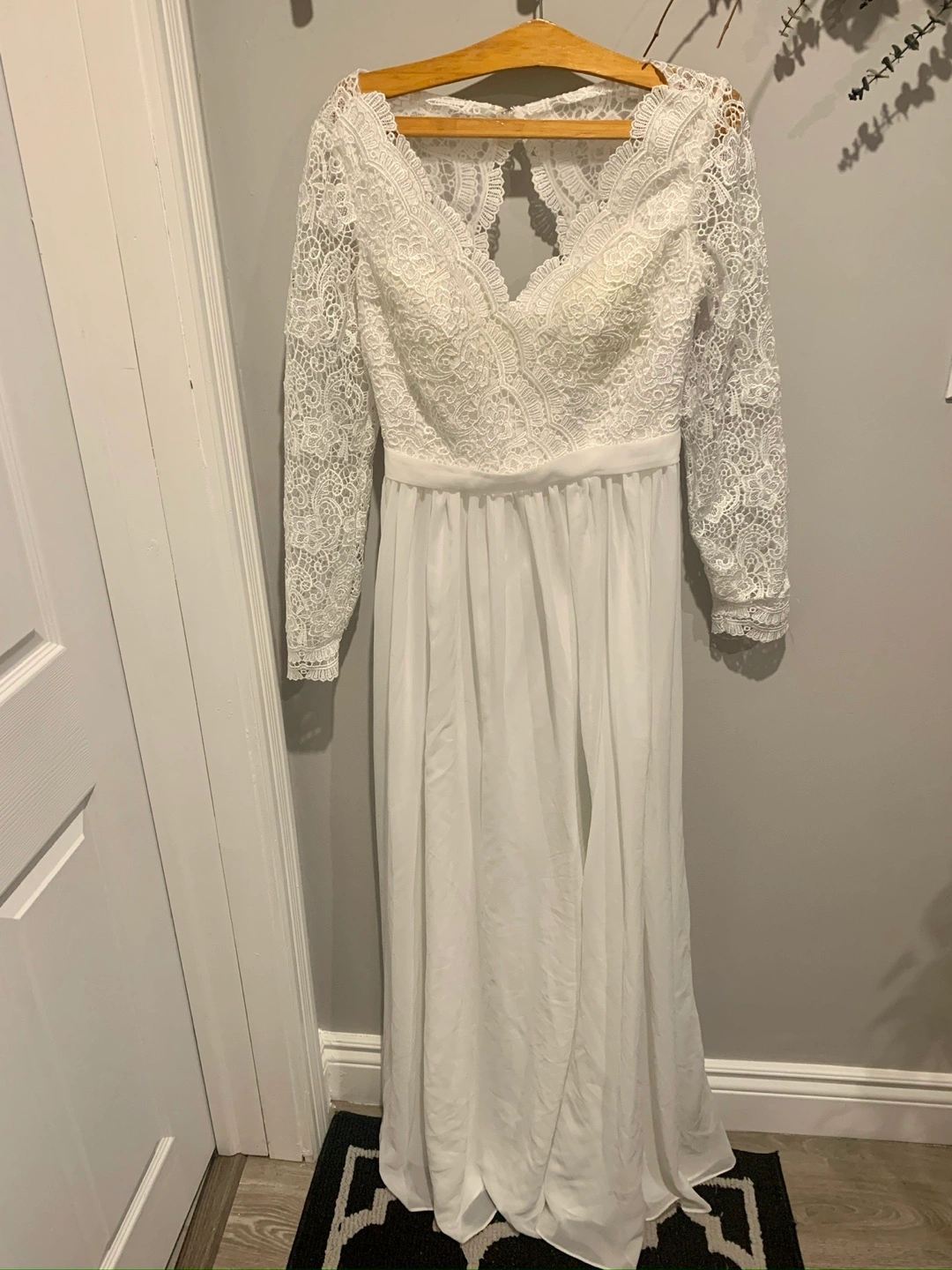 Gorgeous white wedding dress. Long sleeves, V-neckline, and beautiful lace detailing. Flowy chiffon fabric. Cleaned and ready to wear. Price is firm. Pick up only.