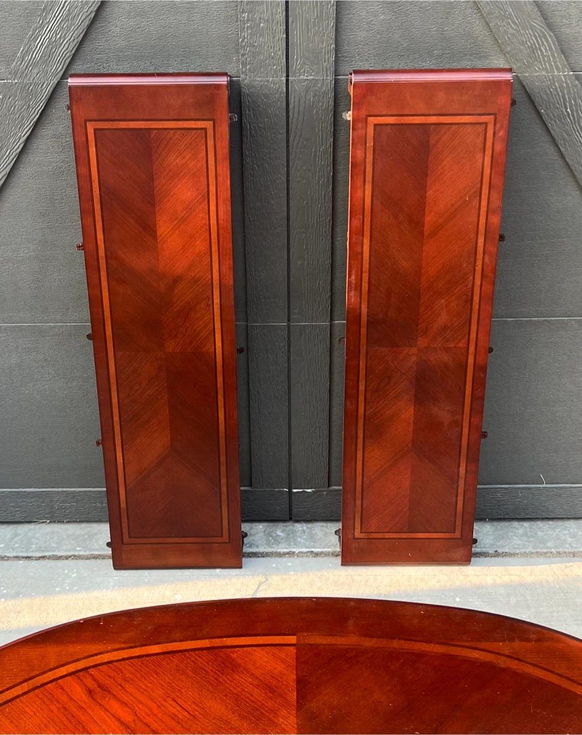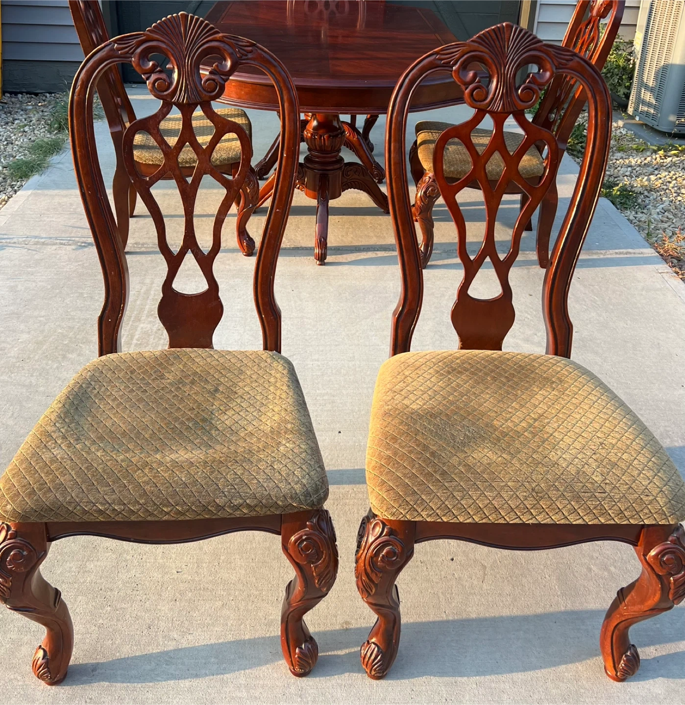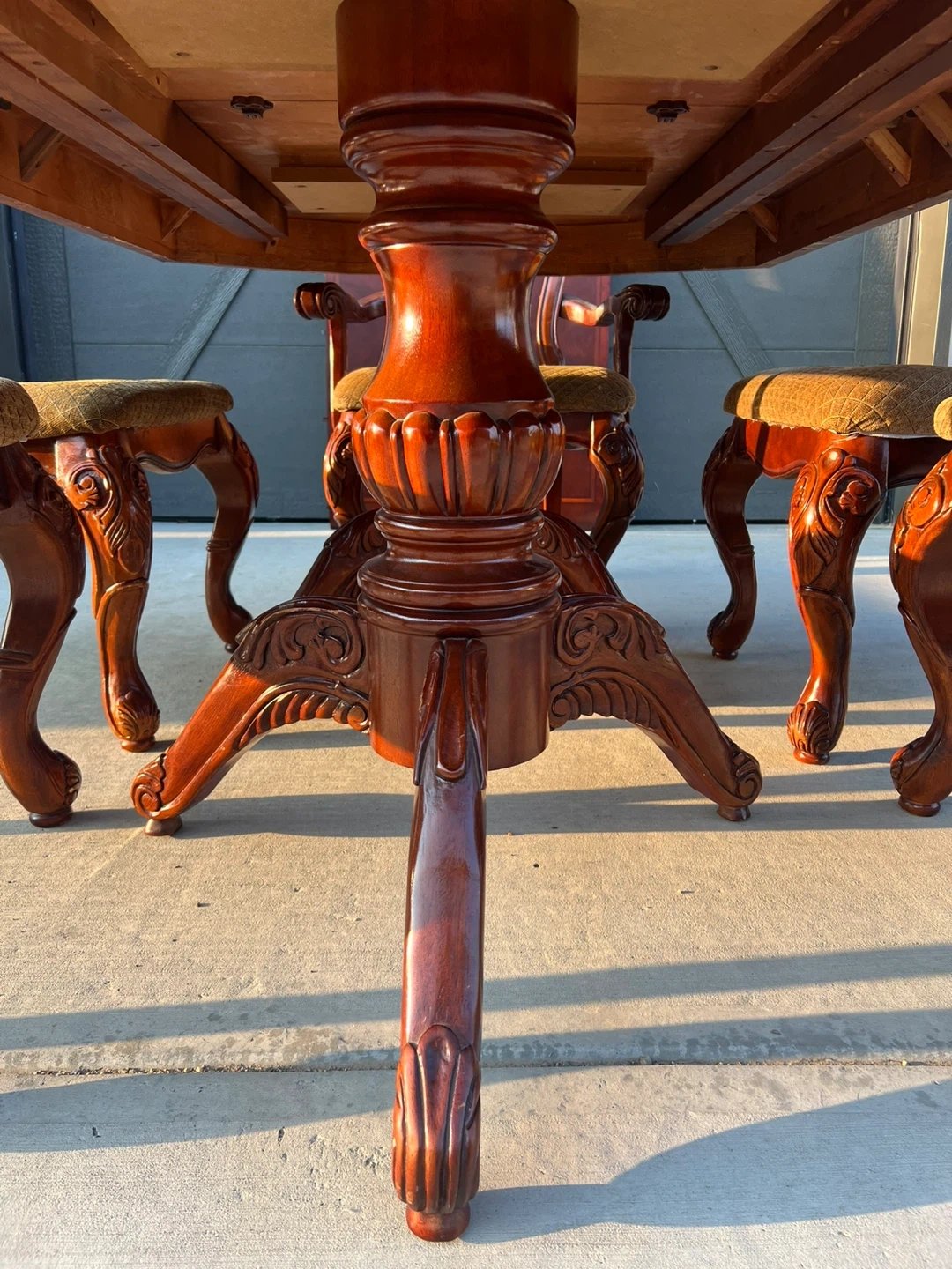 Selling a beautiful mahogany dining table set, complete with five chairs! The table has a unique pedestal base and the chairs feature a decorative back design and comfortable upholstered seats. It's a stunning set that would add a touch of elegance to any dining room. Delivery available Dimensions: 72”x44”x31”