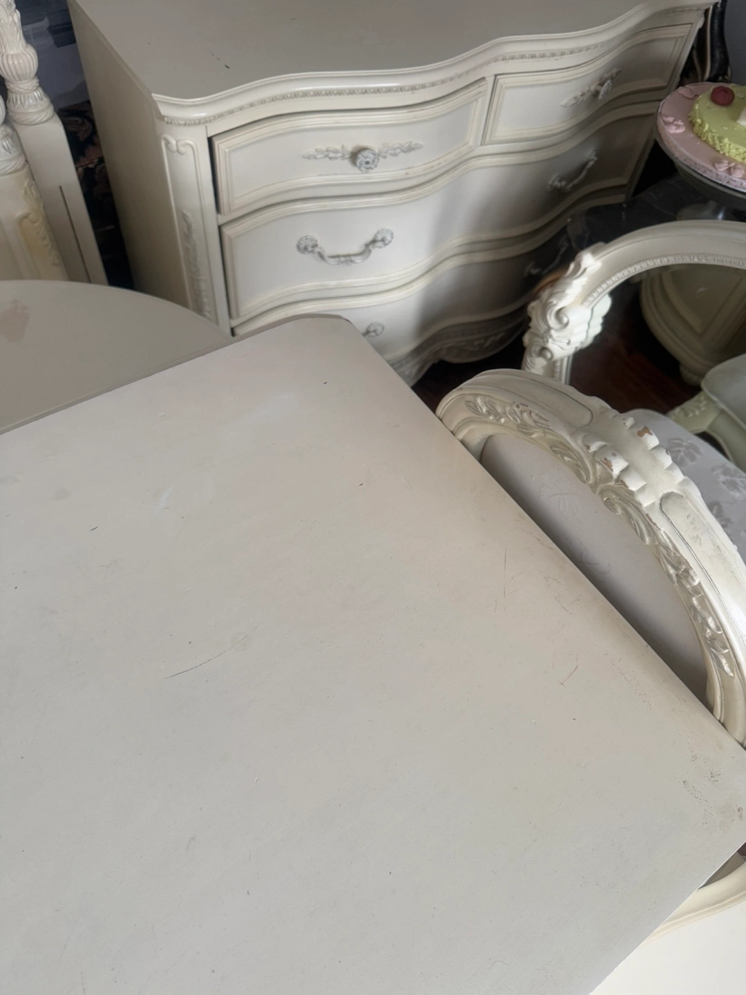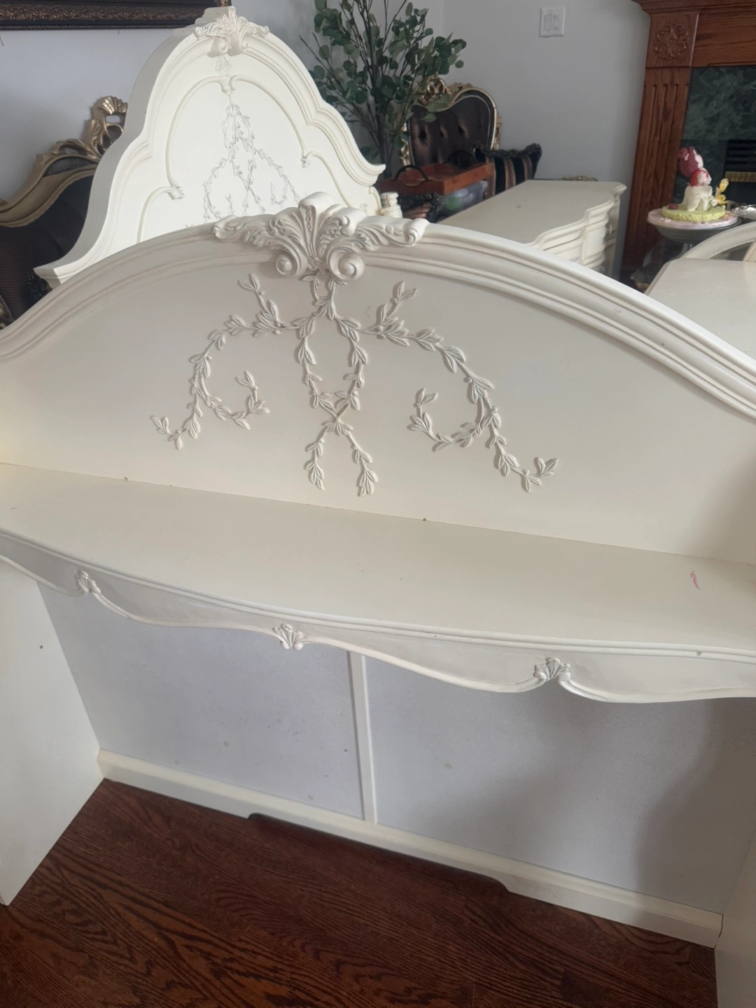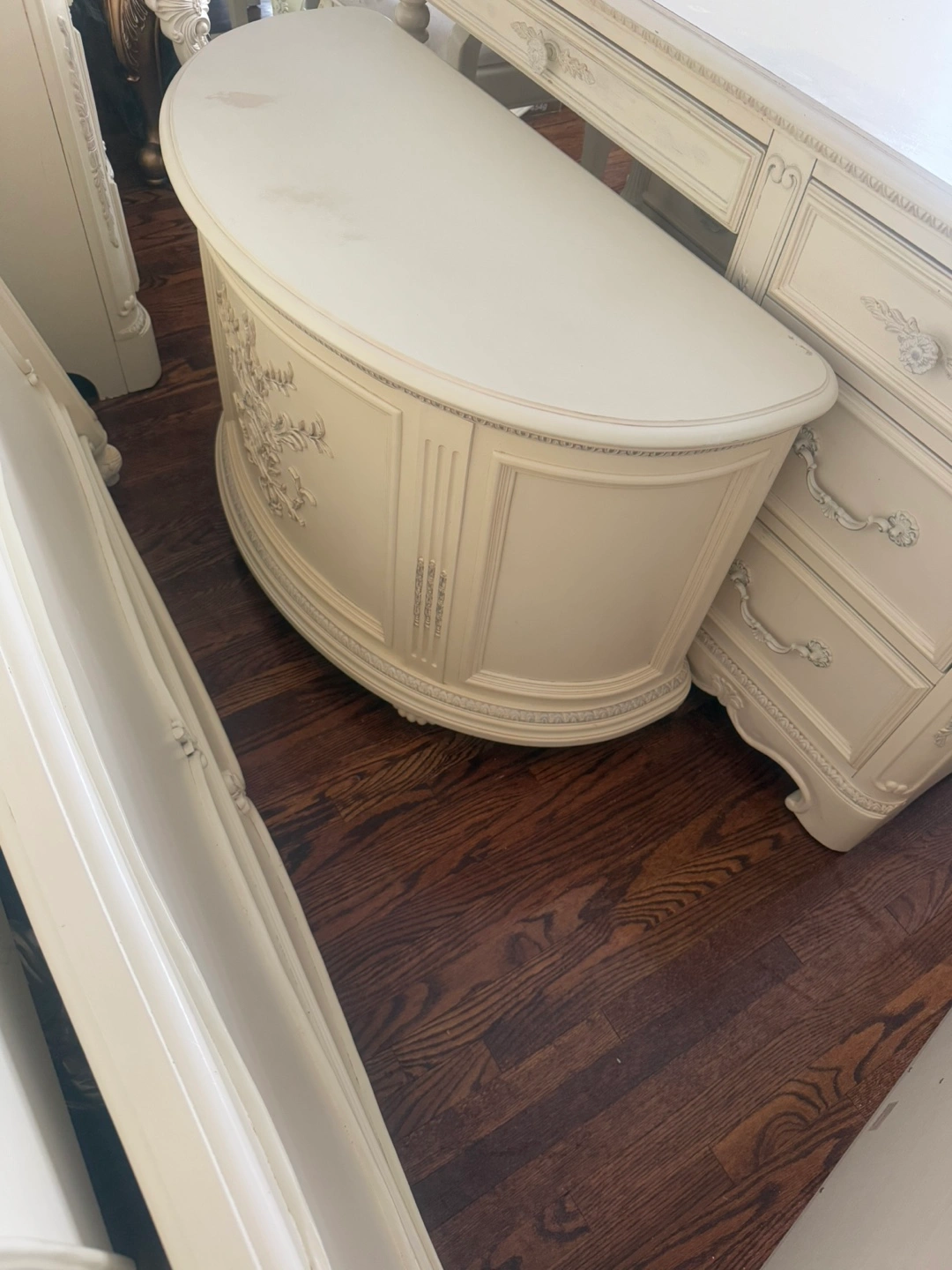 Beautiful off-white bedroom furniture set. Includes a queen-size bed frame, two nightstands, a dresser, and a vanity with a mirror and stool. Ornate detailing throughout. Some minor wear and tear.
