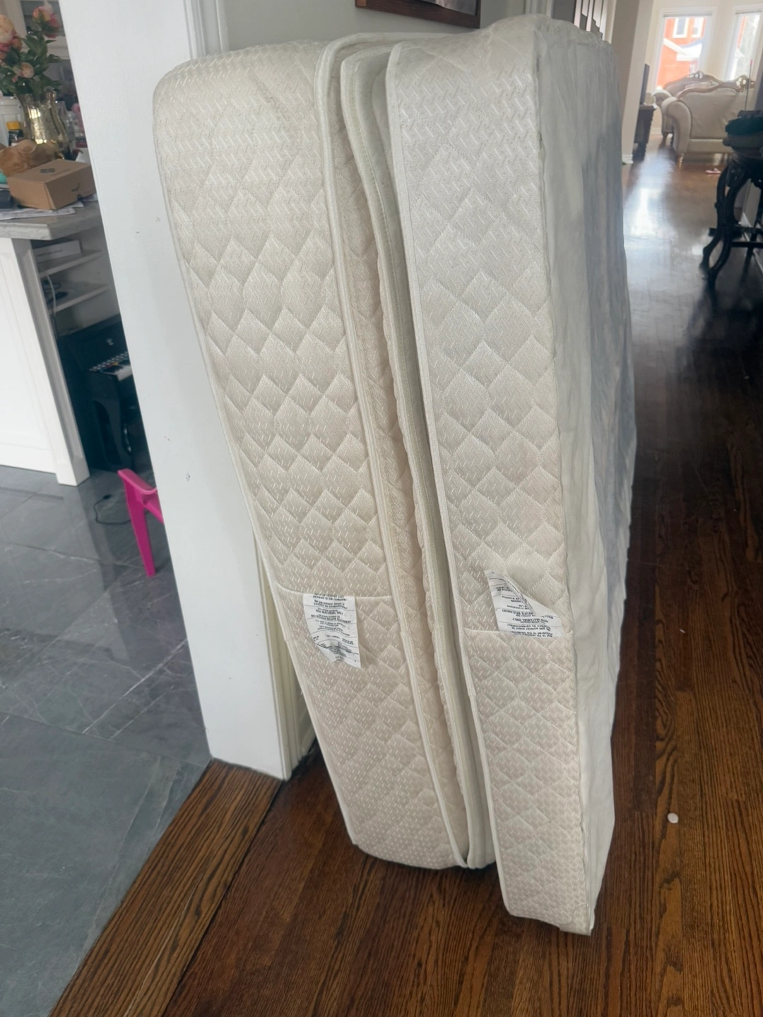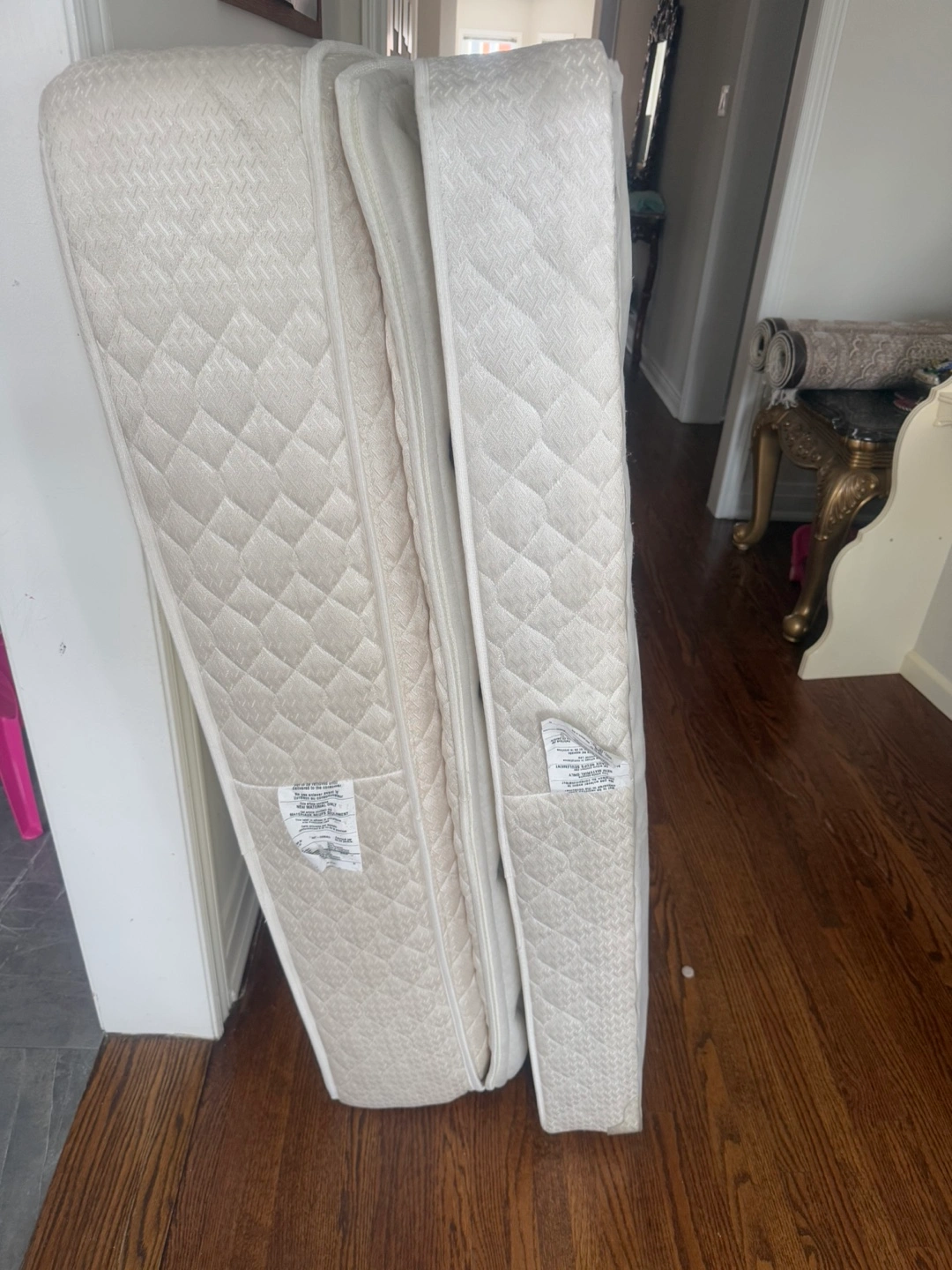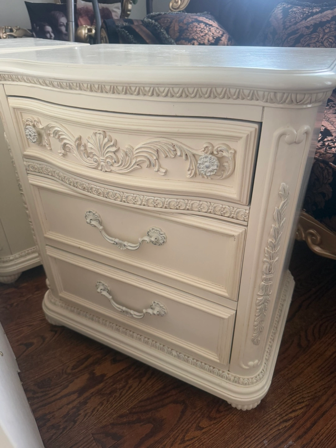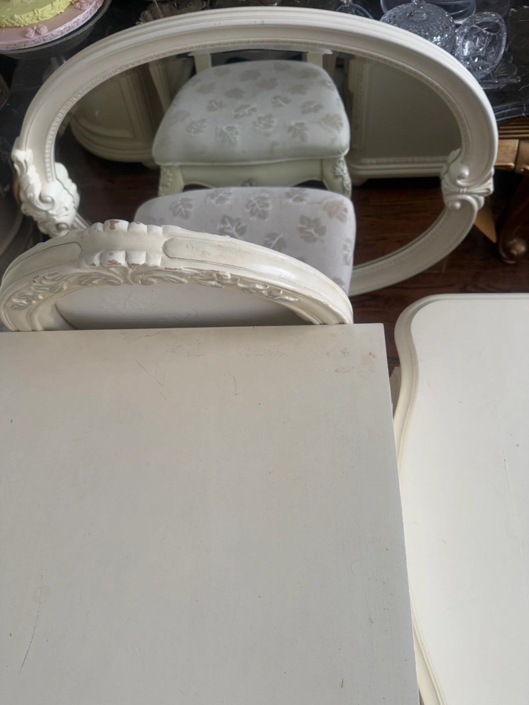 Beautiful off-white bedroom furniture set. Includes a queen-size bed frame, two nightstands, a dresser, and a vanity with a mirror and stool. Ornate detailing throughout. Some minor wear and tear.