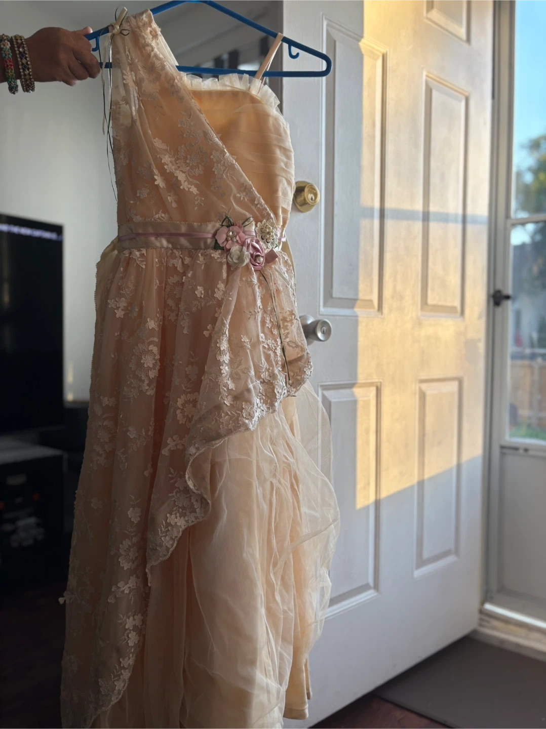 A beautiful peach dress with delicate floral embellishments. Perfect for a special occasion or a fancy night out! It features a unique one-shoulder design and a lovely ribbon at the waist. It's in great condition and ready for a new home