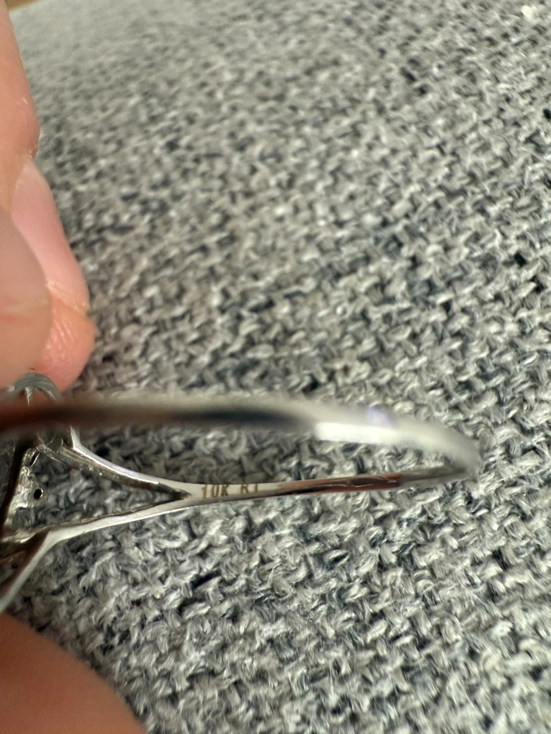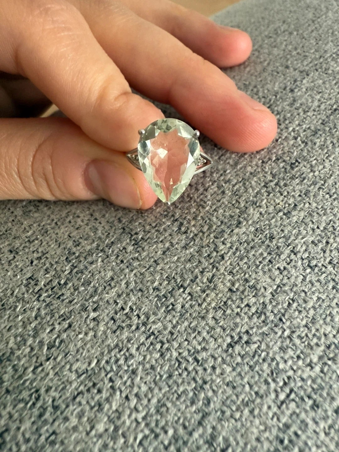 Beautiful ring featuring a pear-shaped moissanite gemstone. Silver band. Comes in original box.
