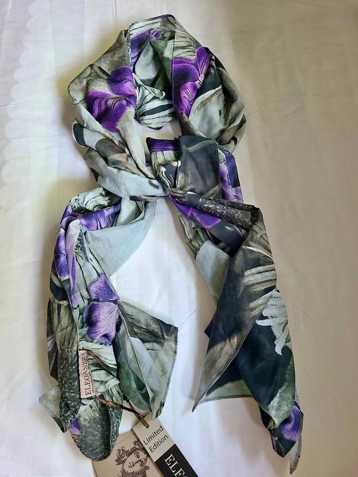 Lovely limited edition new scarf by Eleganzza. Still has the tags on. 50% silk & 50% cotton. 67in x 25in. Pick up near Lou's Grill in Abbotsford.