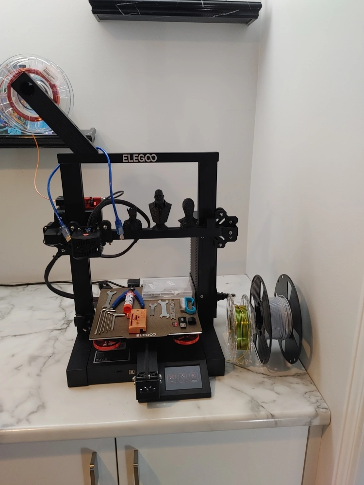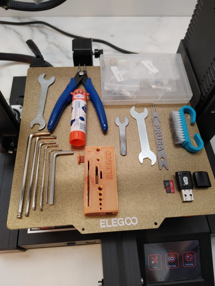 Selling an Elegoo 3D printer. It's in great condition and ready for your next project! Comes with various tools and accessories as pictured, including wrenches, pliers, and filament.