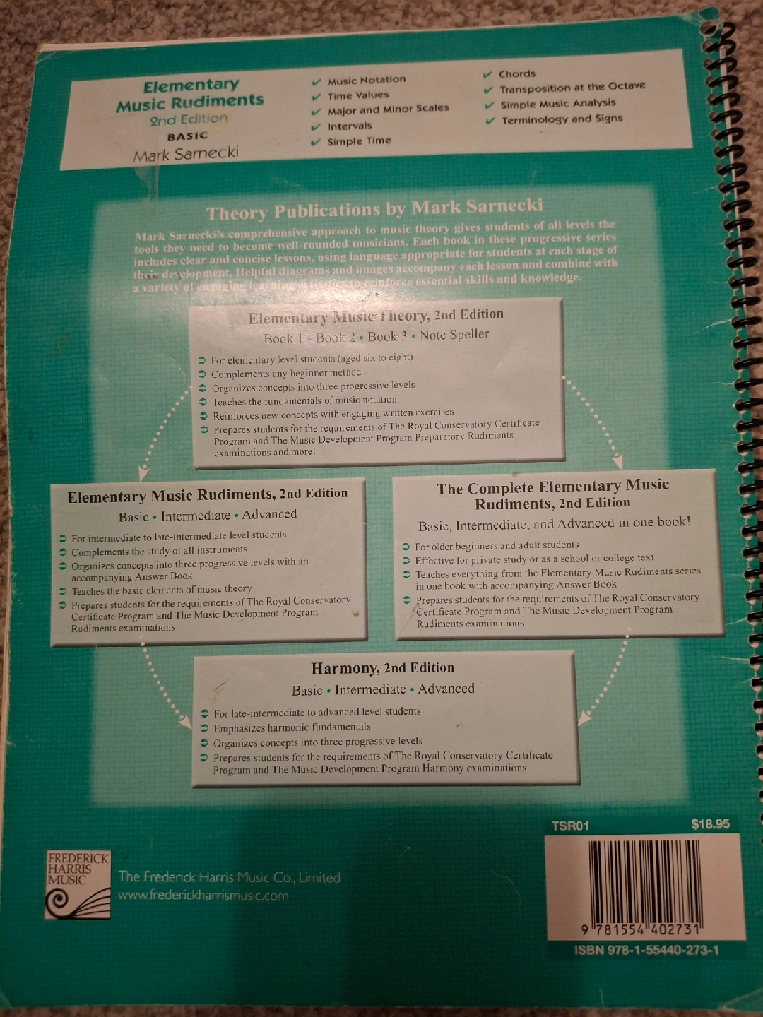 Selling "Elementary Music Rudiments, 2nd Edition" by Mark Sarnecki. This book is designed for intermediate to late-intermediate level students and equips students, developing all instruments. It also organizes concepts into three progressive levels with an accompanying Answer Book. Originally bought for $18.95