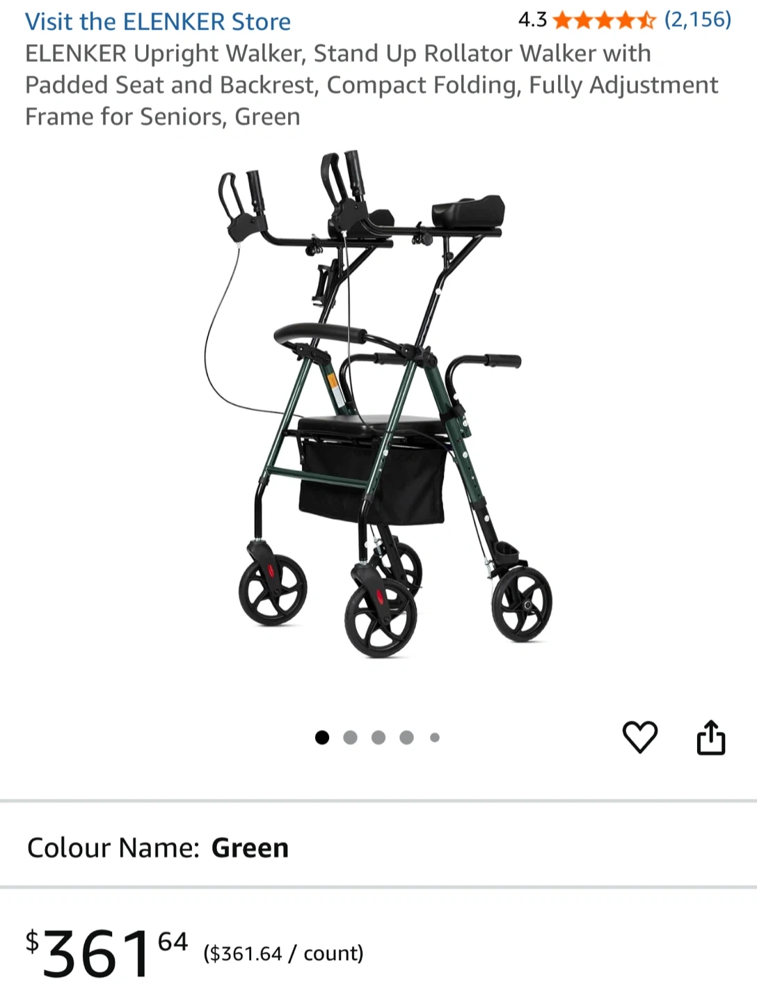 Selling a green ELENKER Upright Walker. It's a stand-up rollator walker with a padded seat and backrest. It also features a compact folding frame and is fully adjustable for seniors. Originally bought for $361.64 Pick up - Courtice Please check my other listings
