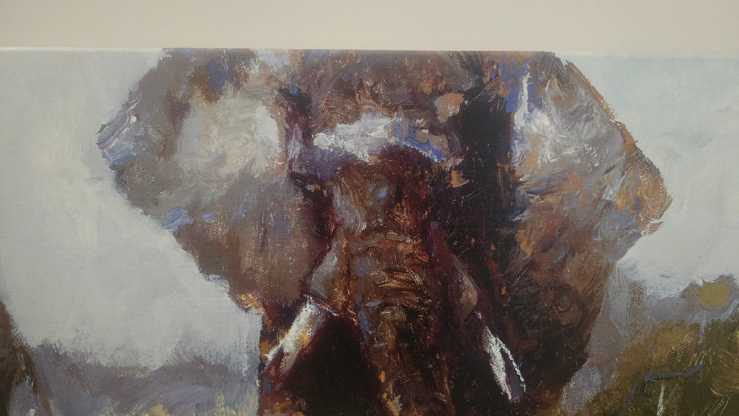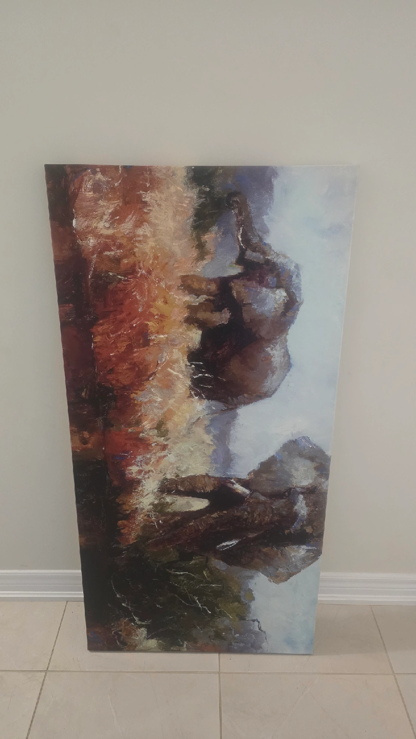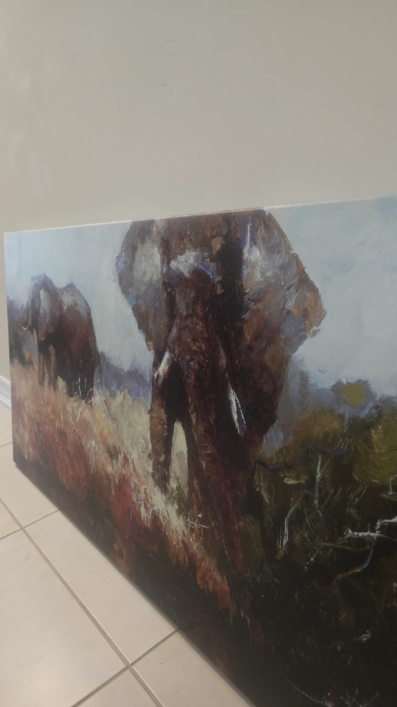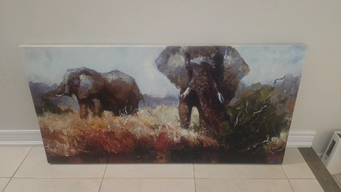 Elephant art on canvas. No damage, in very good condition. Measures 48 x 24 x 1.5 inches Pick up in Stoney Creek, Fruitland area Cash only please