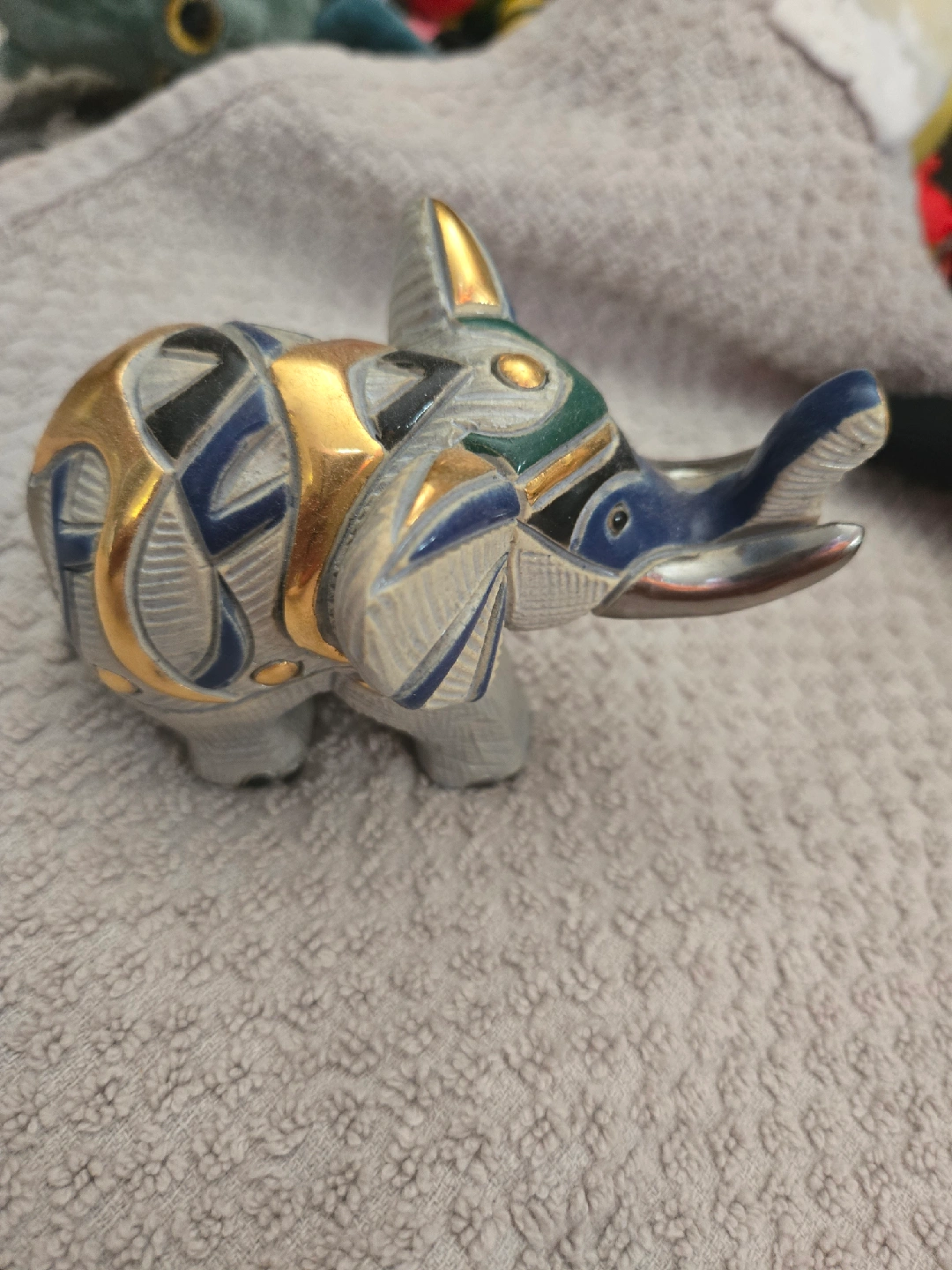 Cute elephant figurine with gold, blue, and green accents! It's a unique piece that would look great on a shelf or desk. It's in great condition and ready for a new home