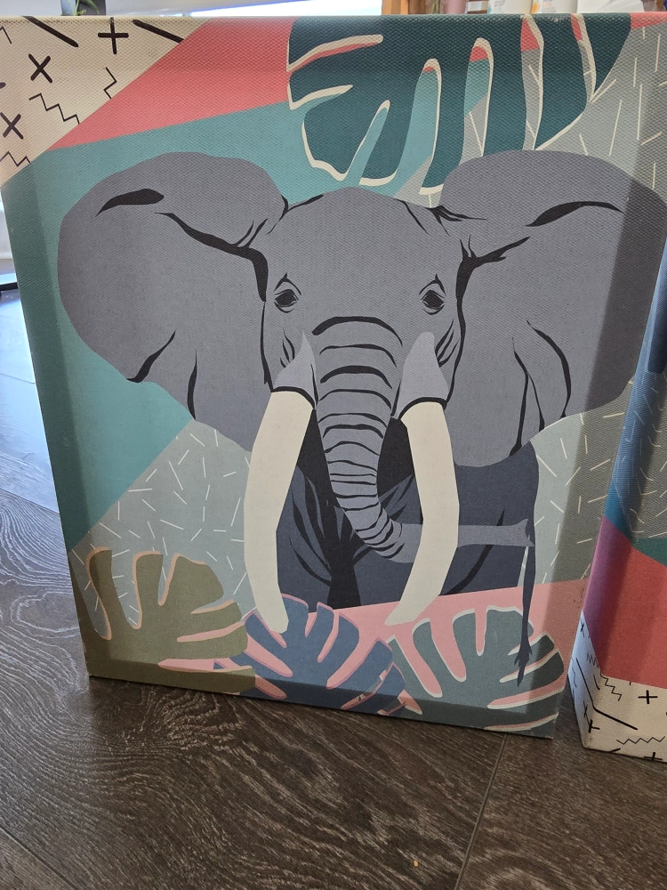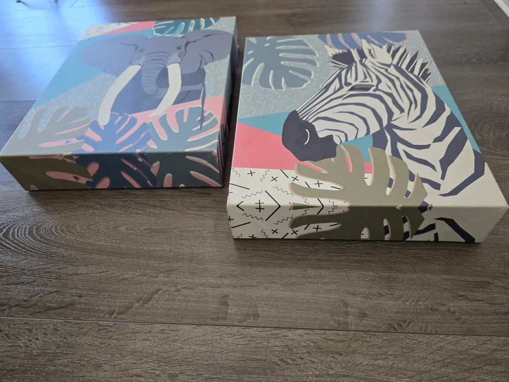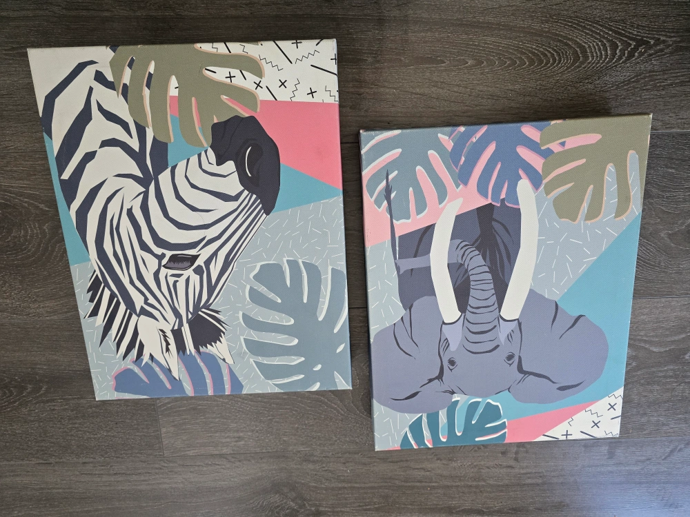 Selling a set of two canvas wall art pieces! One features a cool elephant design and the other has a zebra. They'd look great in a living room or bedroom