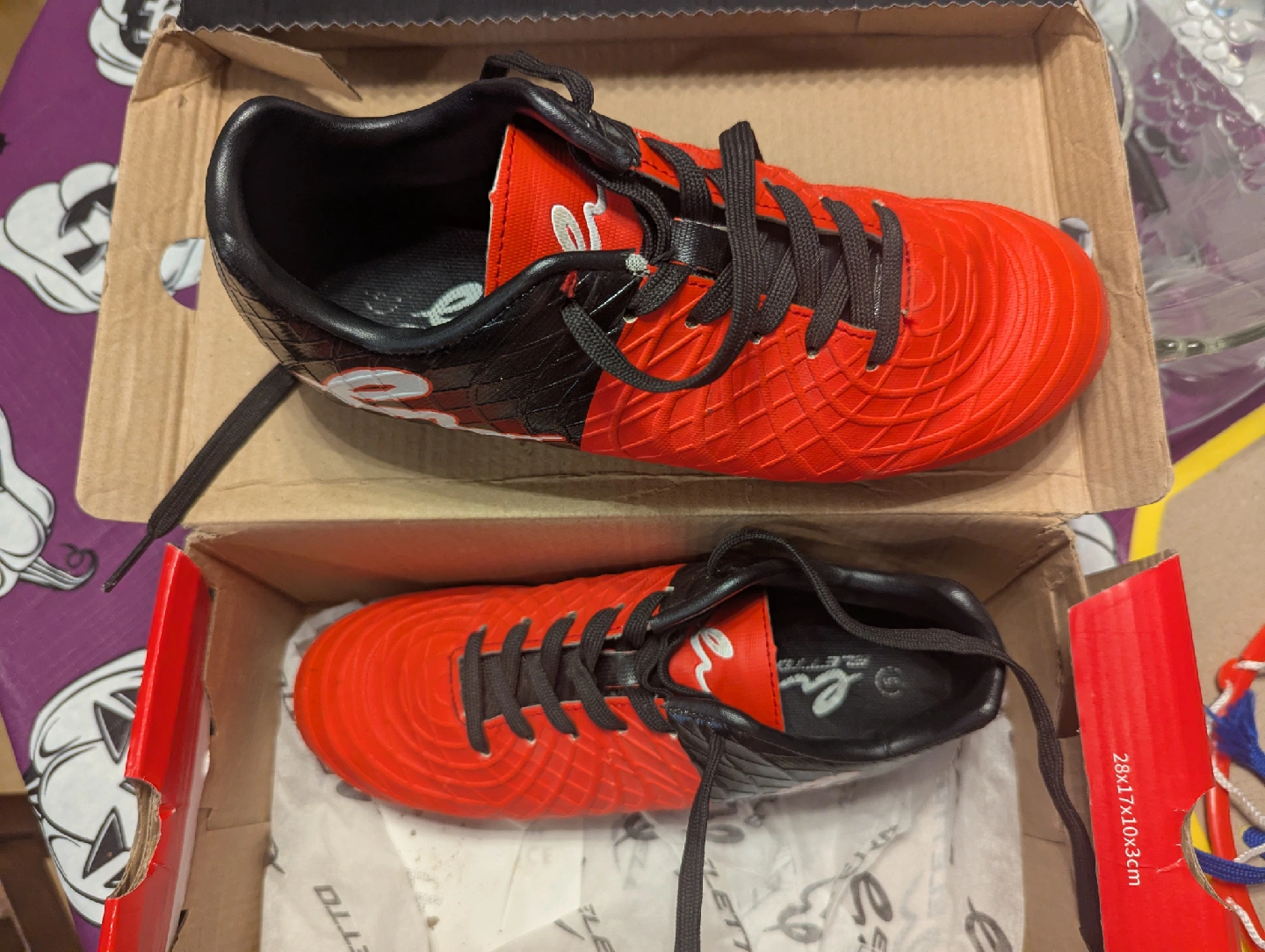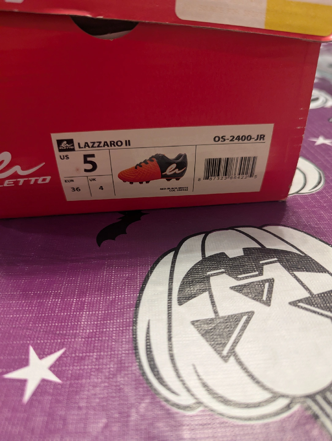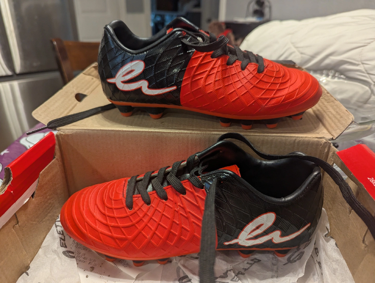 Selling a pair of Eletto Lazzaro II JR soccer cleats in excellent condition! They are a US size 5 and come in the original box. These cleats feature a vibrant red and black design. Perfect for young soccer players!