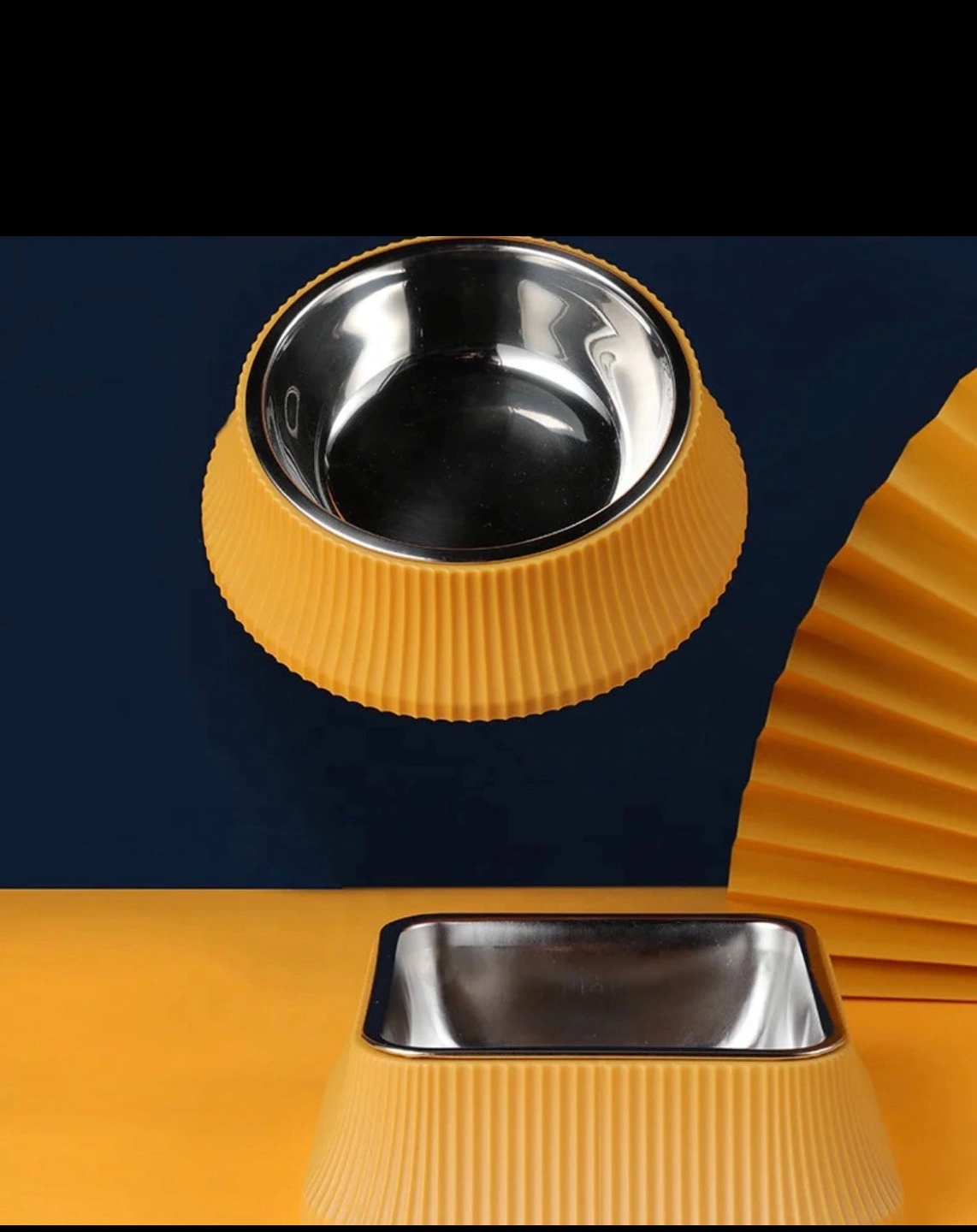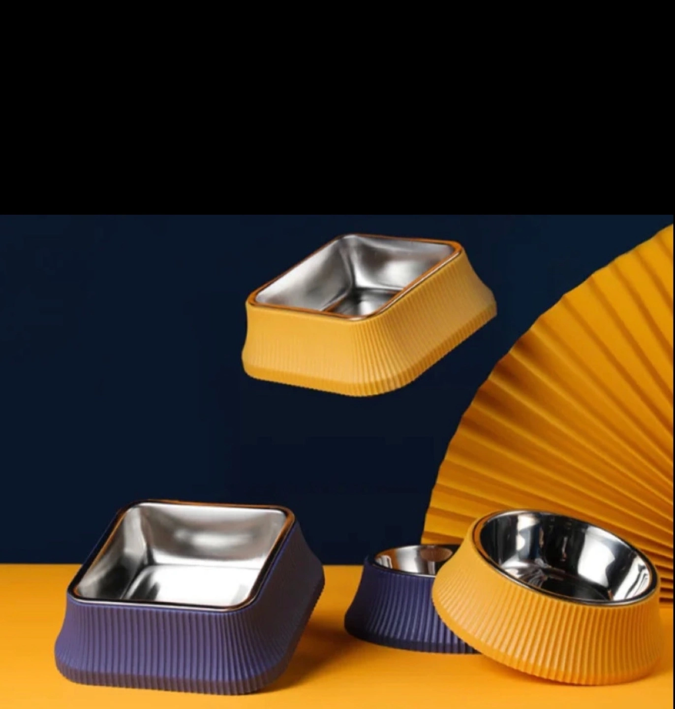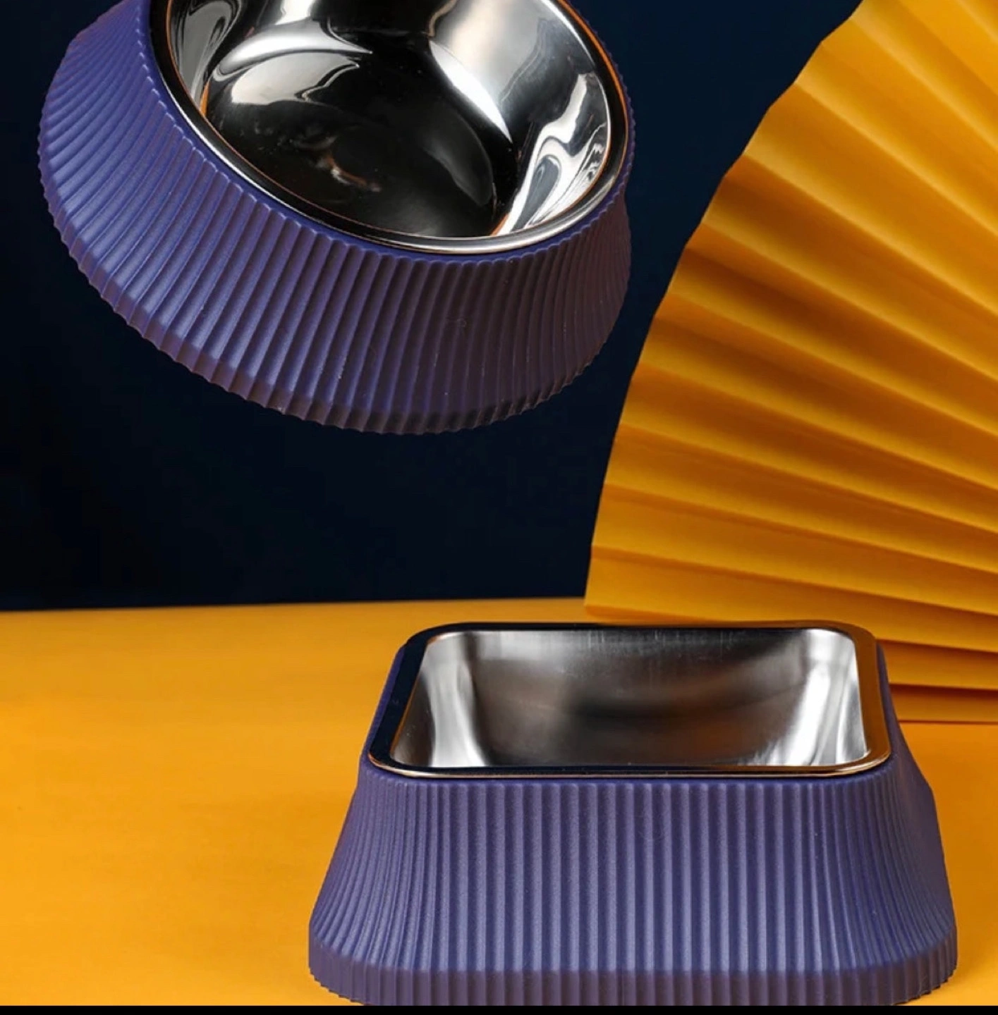 Stylish and functional pet bowl. Features a raised design for comfortable eating. Durable stainless steel insert. Available in yellow and purple. Easy to clean.