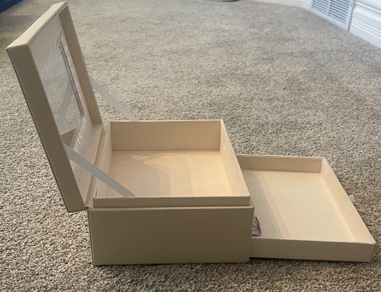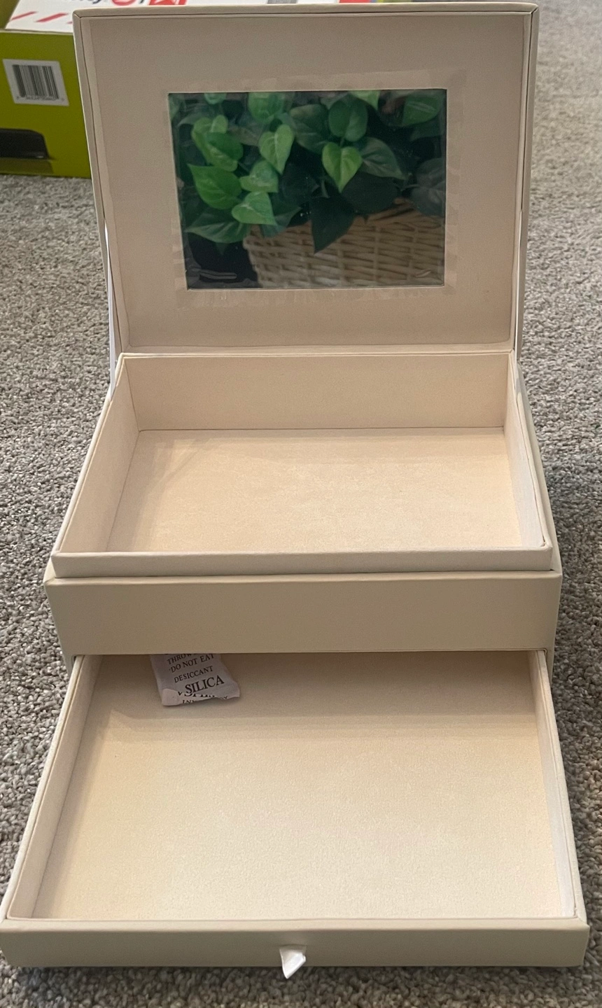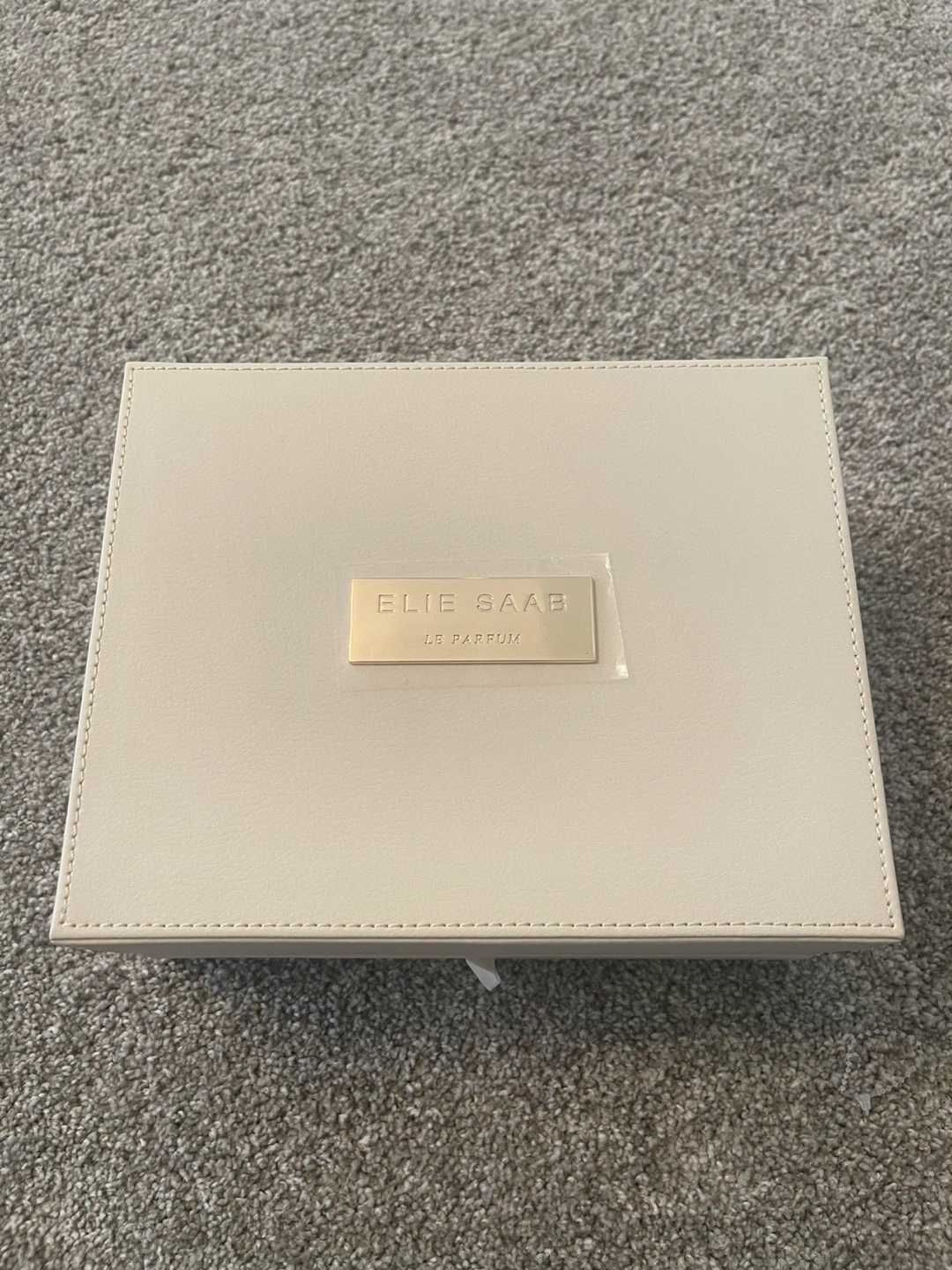 Selling a sturdy gift box from world-renowned Elie Saab designer! This box measures 8.5" x 6.625" x 3.75". It has a large mirror inside and the lid stays open if desired. Perfect for storing your precious items!